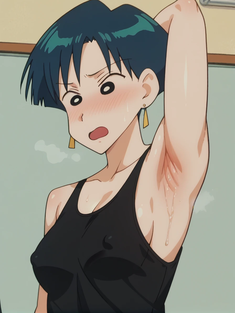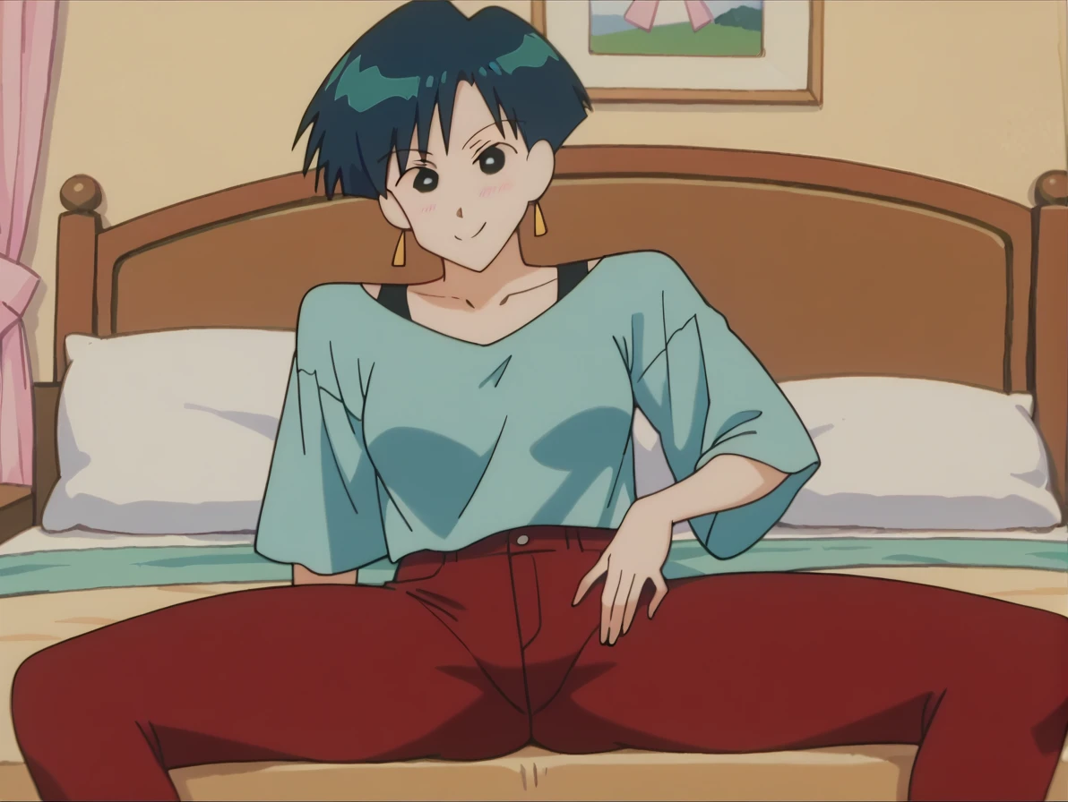 Trigger word: burirururu, short hair, blue hair, earrings, bangs, black eyes, chinese clothing, long sleeves,wide sleeves, cleavage cutout,brooch,side slit