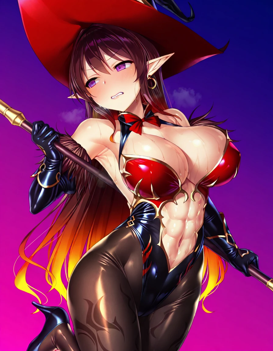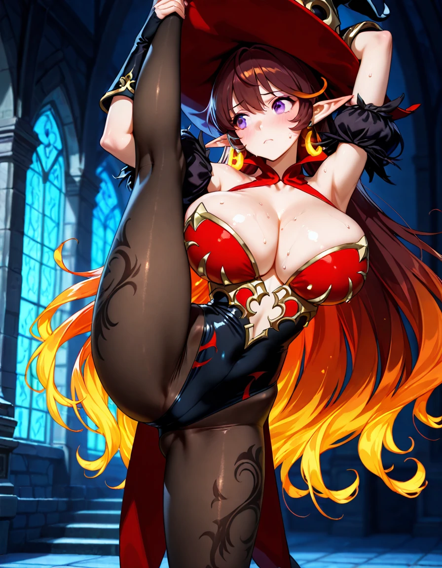 <lora:transcendentnornilnoob:1> transcendentnornilnoob, pointy ears, bare shoulders, pantyhose, witch hat, gloves, brown hair, glowing hair, gradient hair, leotard, witch, very long hair, earrings, purple eyes, (high heels:0.8)