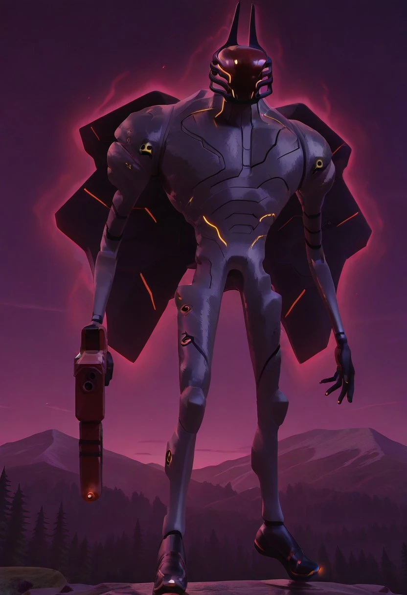 Supreme, giant robot, white metal skin, muscular, red orb as head, no face, black cape, holding giant red gun, black hands and shoes