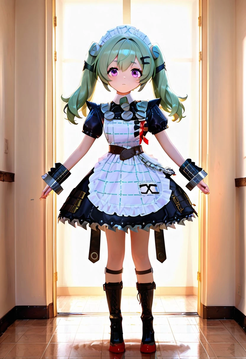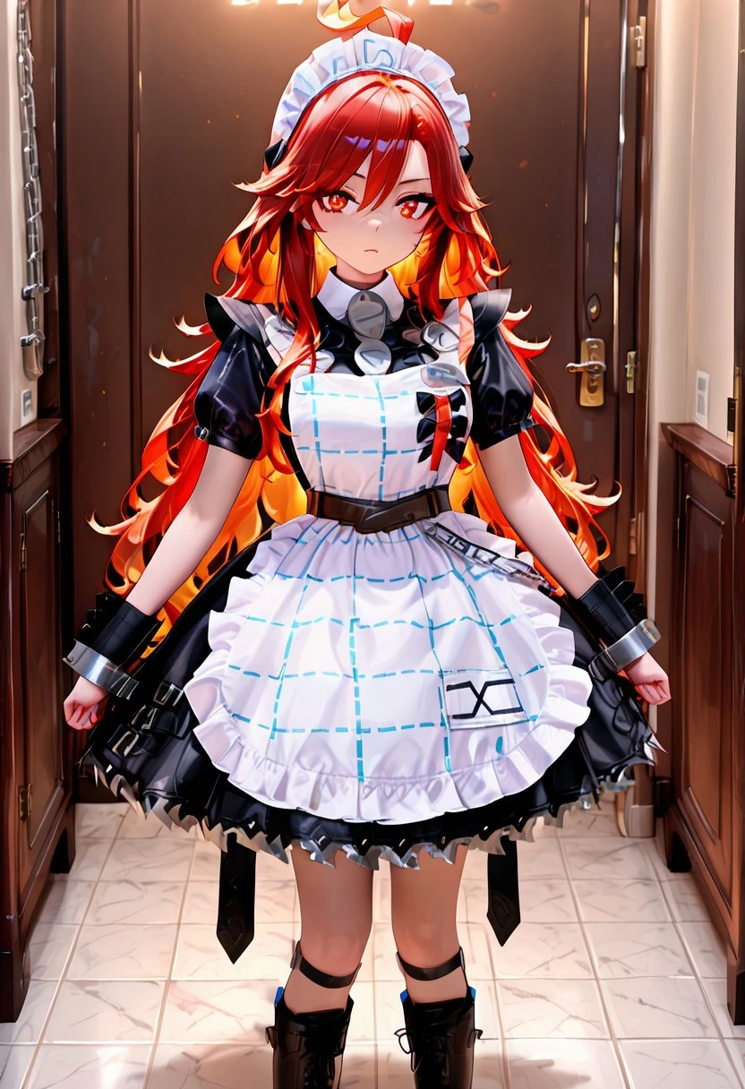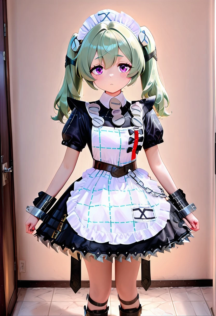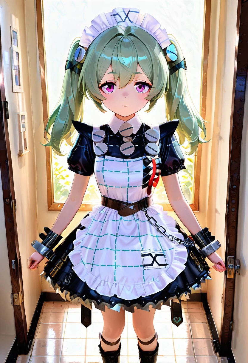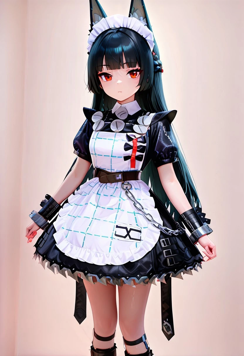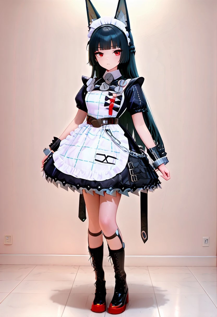 crinclstyle, white maid headdress, black dress, puffy short sleeves, frilled apron, high belt, chains, shin strap, black wristband, metal cuffs, black boots, frilled dress, striped apron,black boots