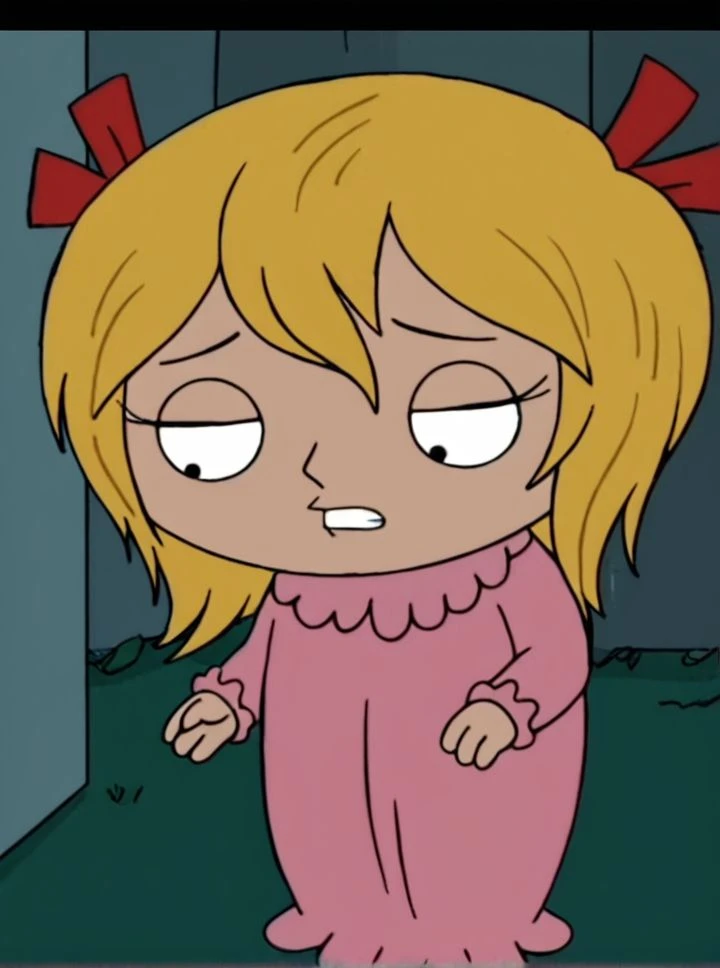 Girl: situweiAminrixiang, 1girl, red ribbon, hair ribbon, yellow hair, bangs, short hair, black eyes, pink dress, long dress