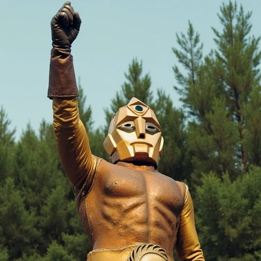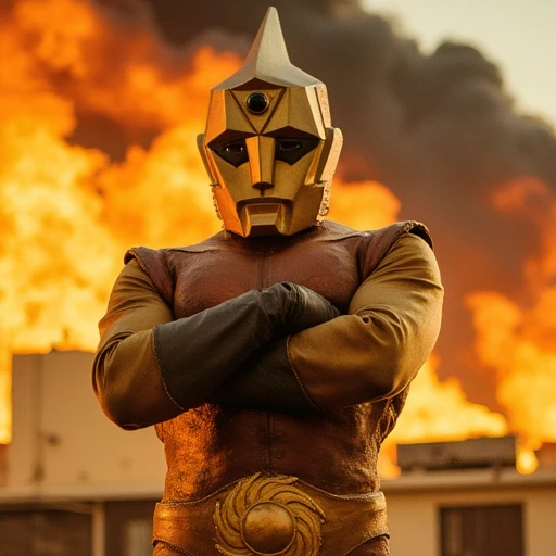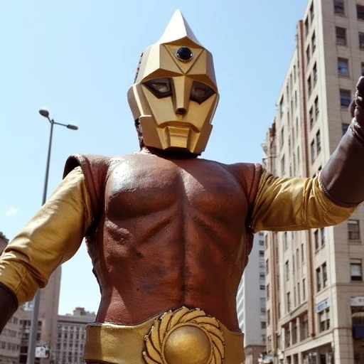 Spectreman, giant superhero, cyborg, gold hard mask, shining green cut hemisphere on forehead, gold , dark brown unitard leather armor, sun design buckle, dark brown gloves, dark brown boots