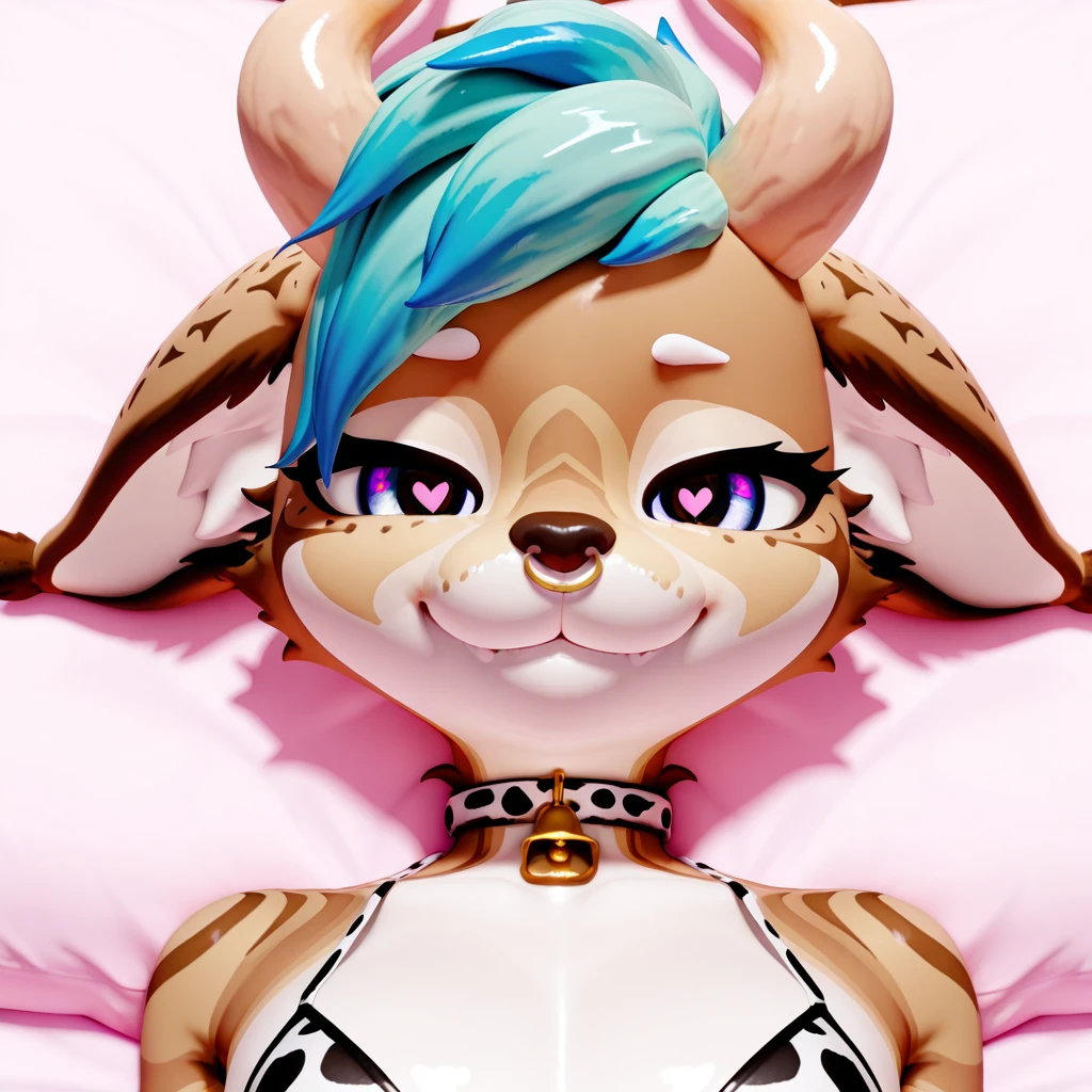 Probably want: "nbfvr, caracal, horns, blue hair, 3d,"