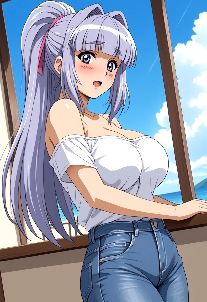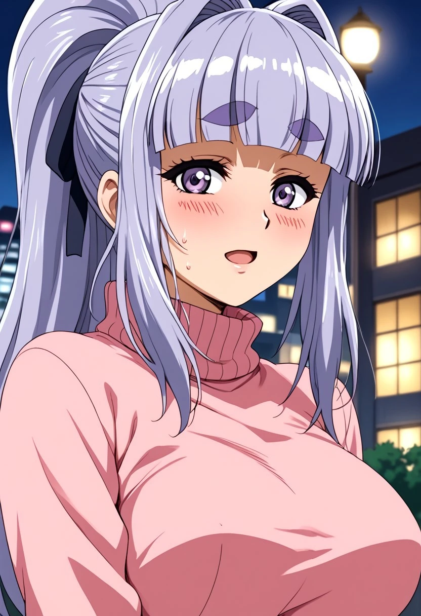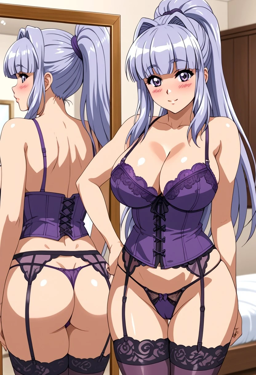1 girl, young, sweet look, big eyes, lilac eyes, cheeks, blushing, cheerful, flirtatious, long hair, straight hair, lilac hair, silver highlights, straight bangs, high ponytail, 2 strands framing her face, big breasts