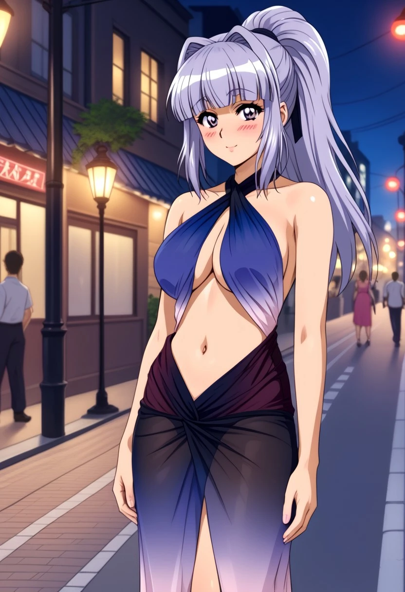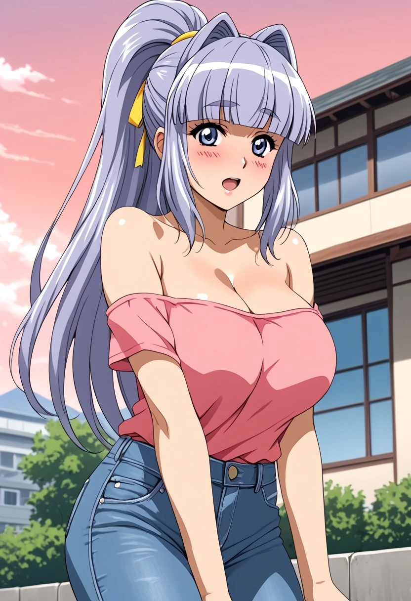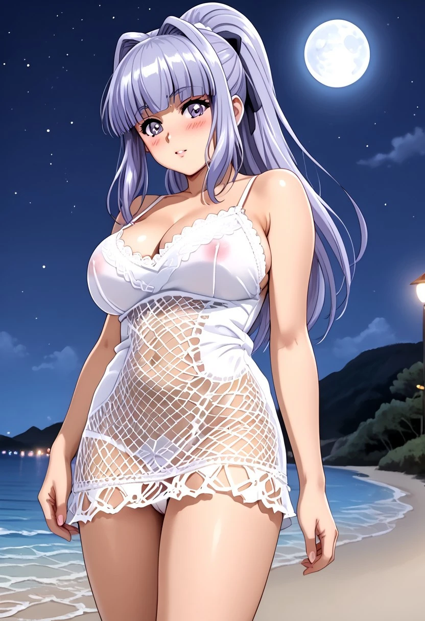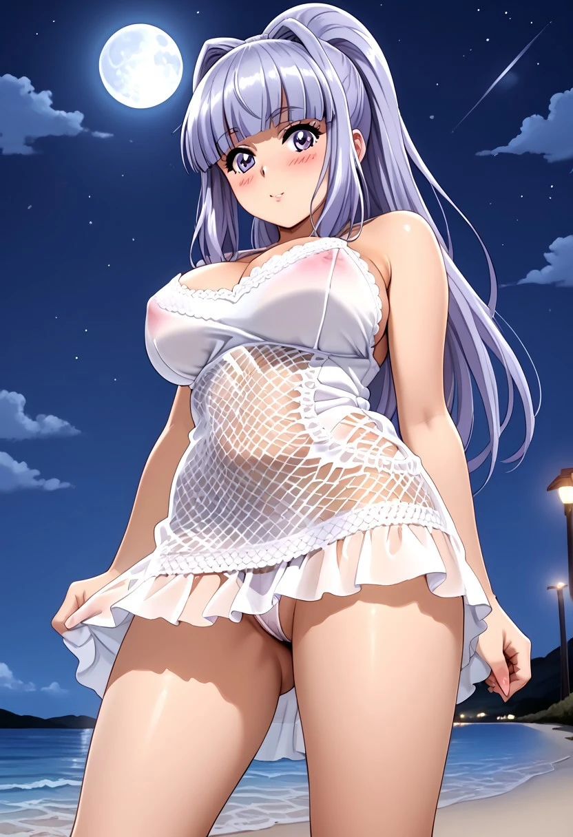1 girl, young, sweet look, big eyes, lilac eyes, cheeks, blushing, cheerful, flirtatious, long hair, straight hair, lilac hair, silver highlights, straight bangs, high ponytail, 2 strands framing her face, big breasts