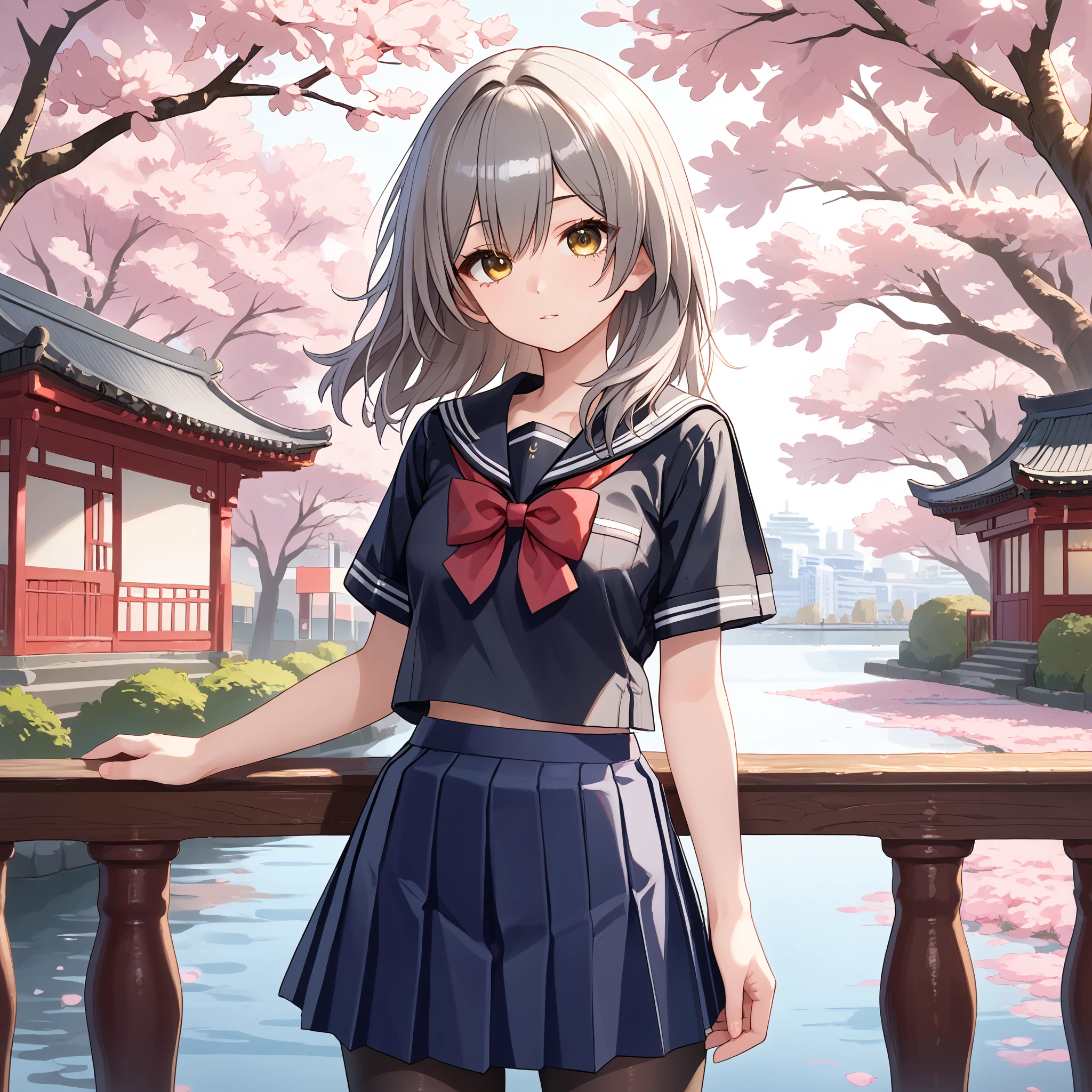 Default : stelle \(honkai: star rail\), medium hair, grey hair, yellow eyes, stelle def, black jacket, open jacket, jacket, coat, white shirt, black gloves, miniskirt, black skirt, thigh strap,Description