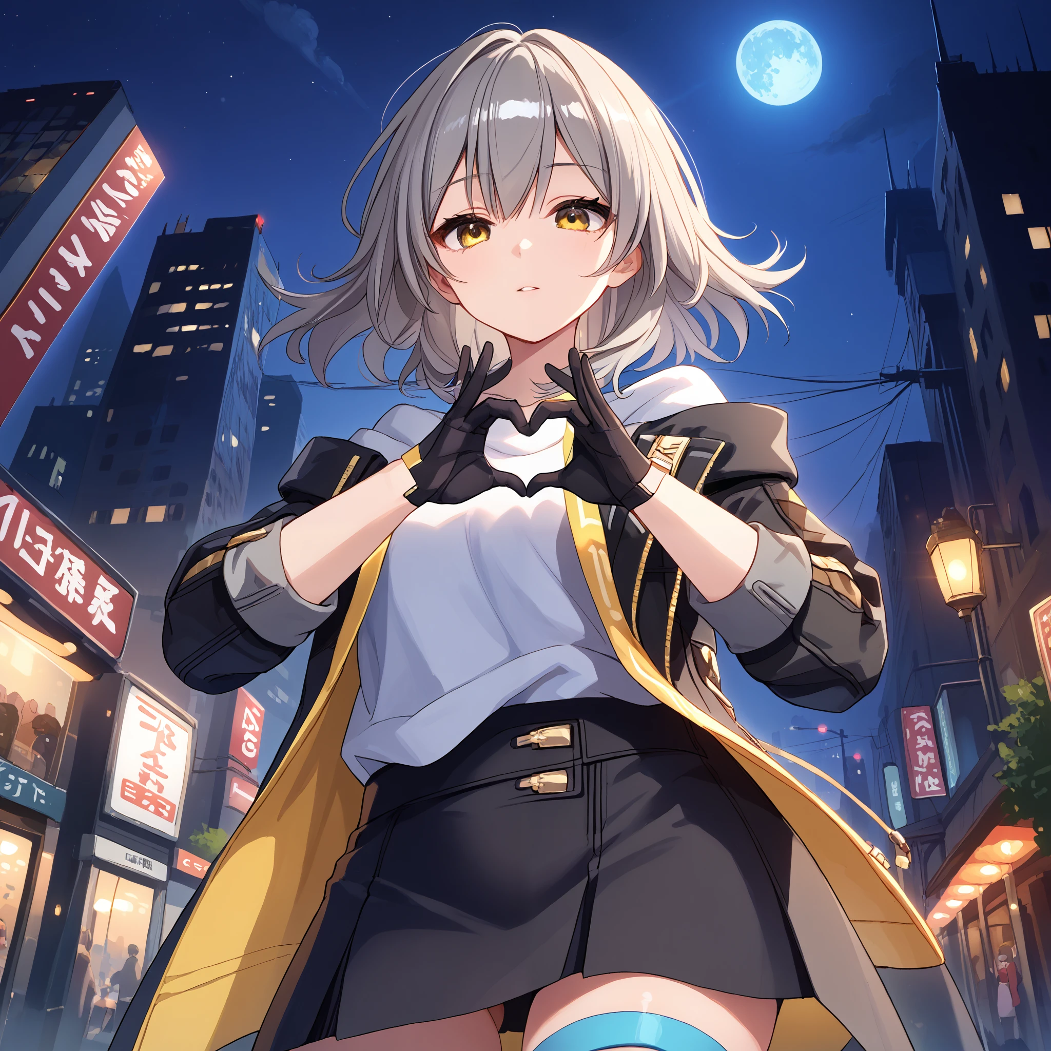 stelle \(honkai: star rail\), medium hair, grey hair, yellow eyes, stelle def, black jacket, open jacket, jacket, coat, white shirt, black gloves, miniskirt, black skirt, thigh strap,