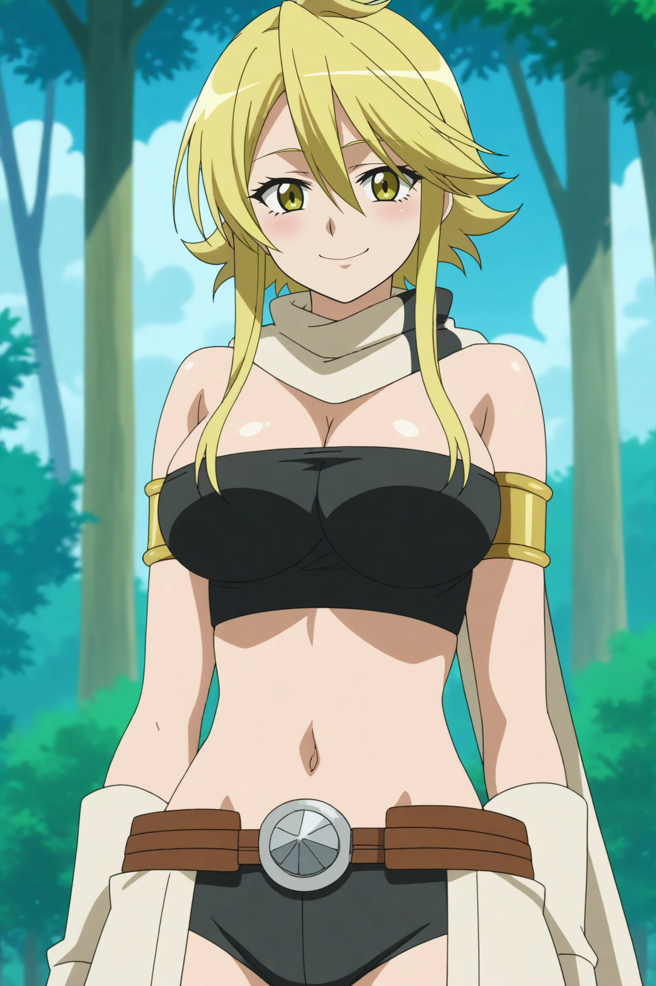 Triggers : leone,breasts,cleavage,smile,yellow eyes,scarf,sidelocks,bare shoulders,hair between eyes,midriff,navel