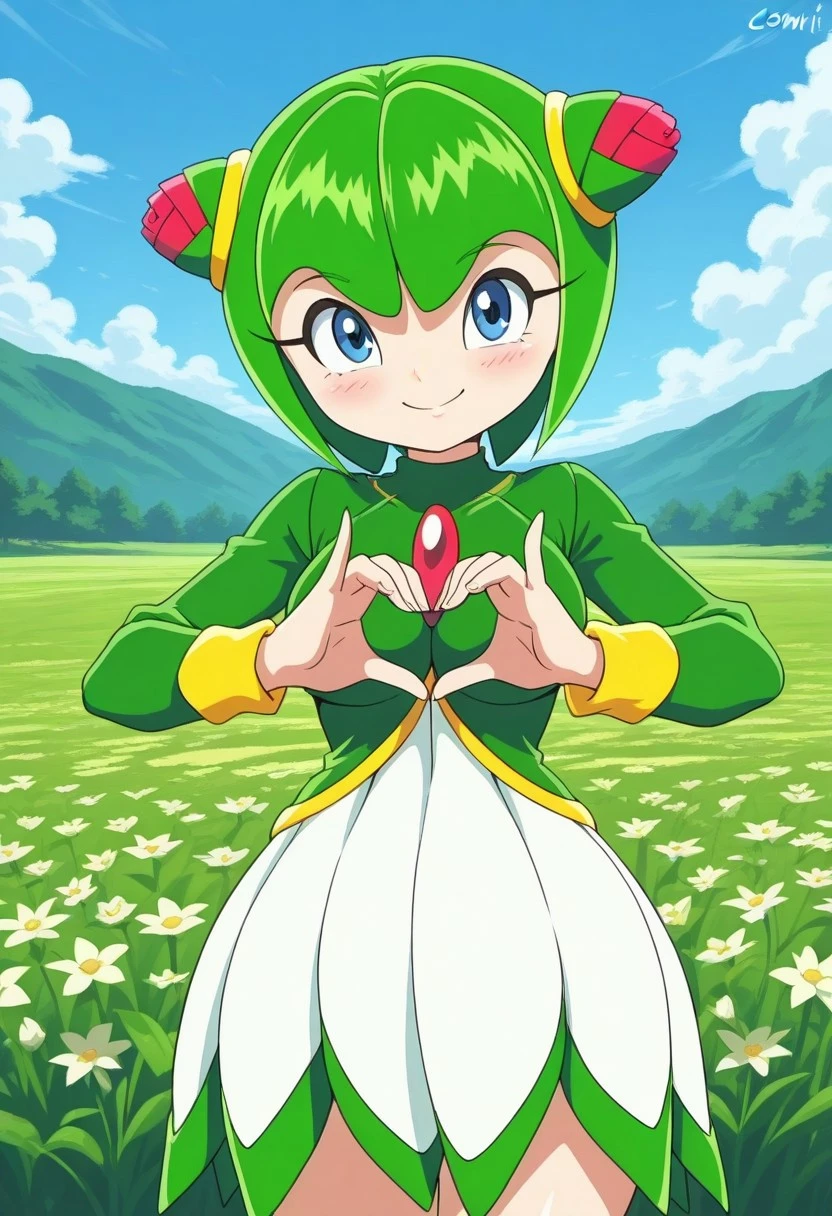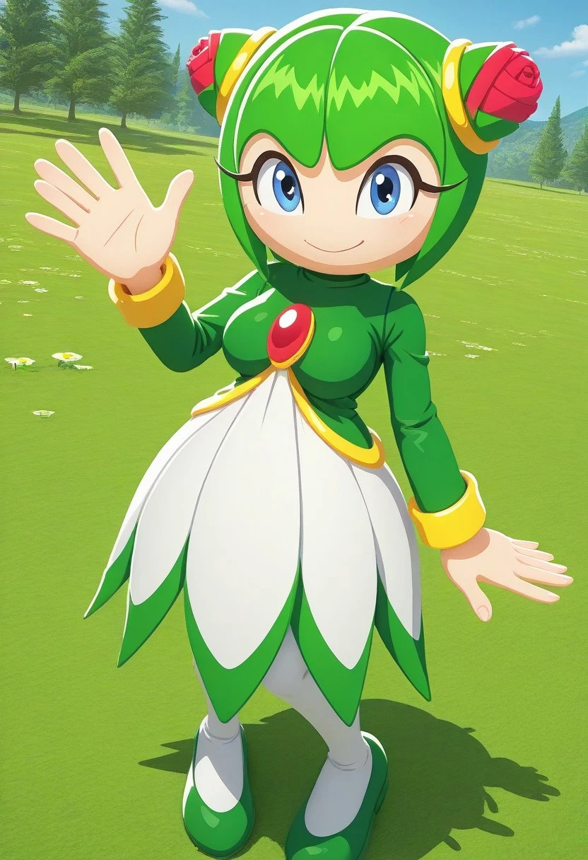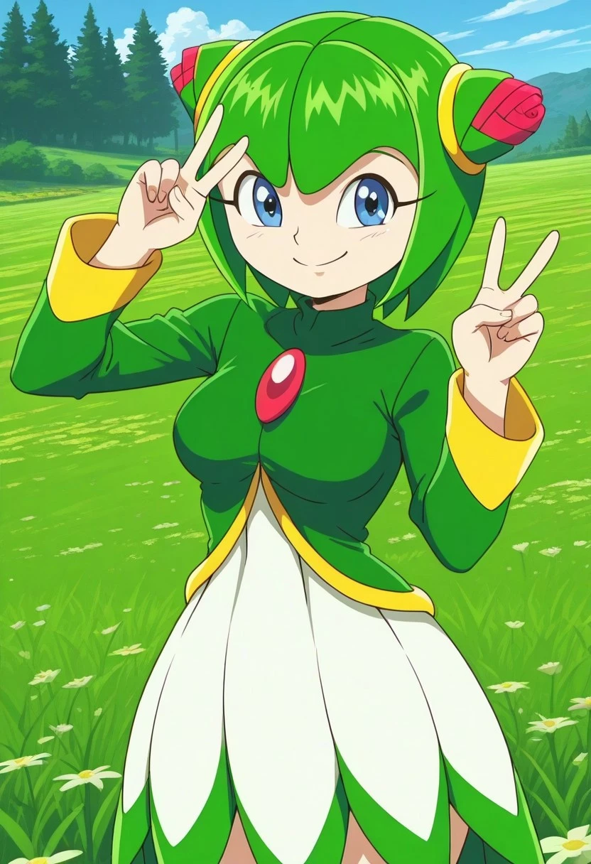 Cosmo, plant girl, flora fauna, green hair, blue eyes, green shirt, long white flower-shaped skirt, red gem in chest