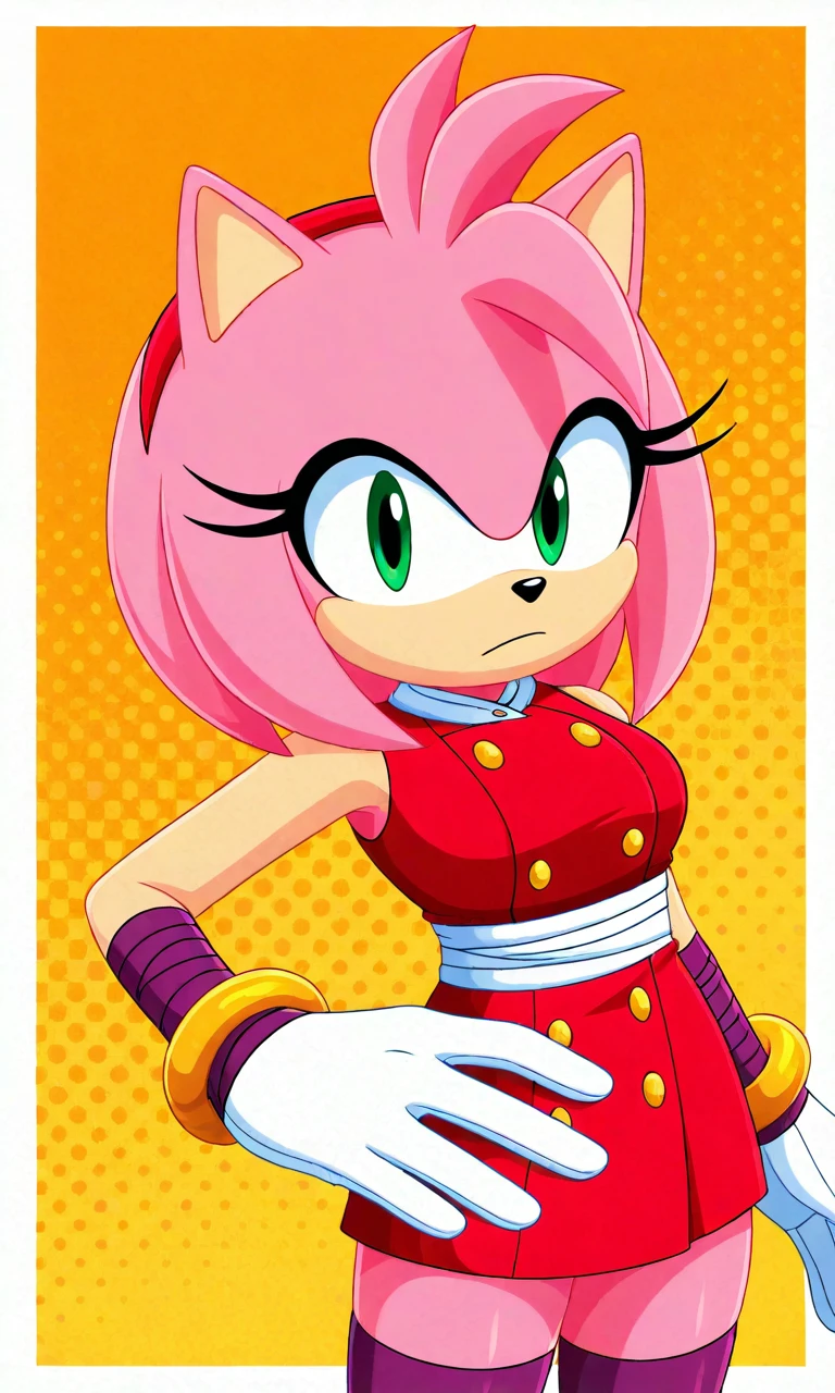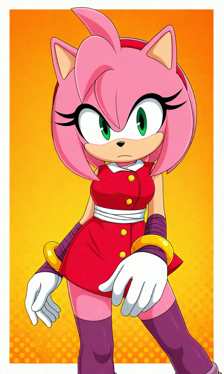 BoomAmyRose, 1girl, bright pink fur, large green eyes, spiked bangs, white gloves, red headband, amy rose, red outfit with yellow buttons, white collar, white bandage belt, purple arm bandage, golden bracelets, purple thighhighs, pink shoes