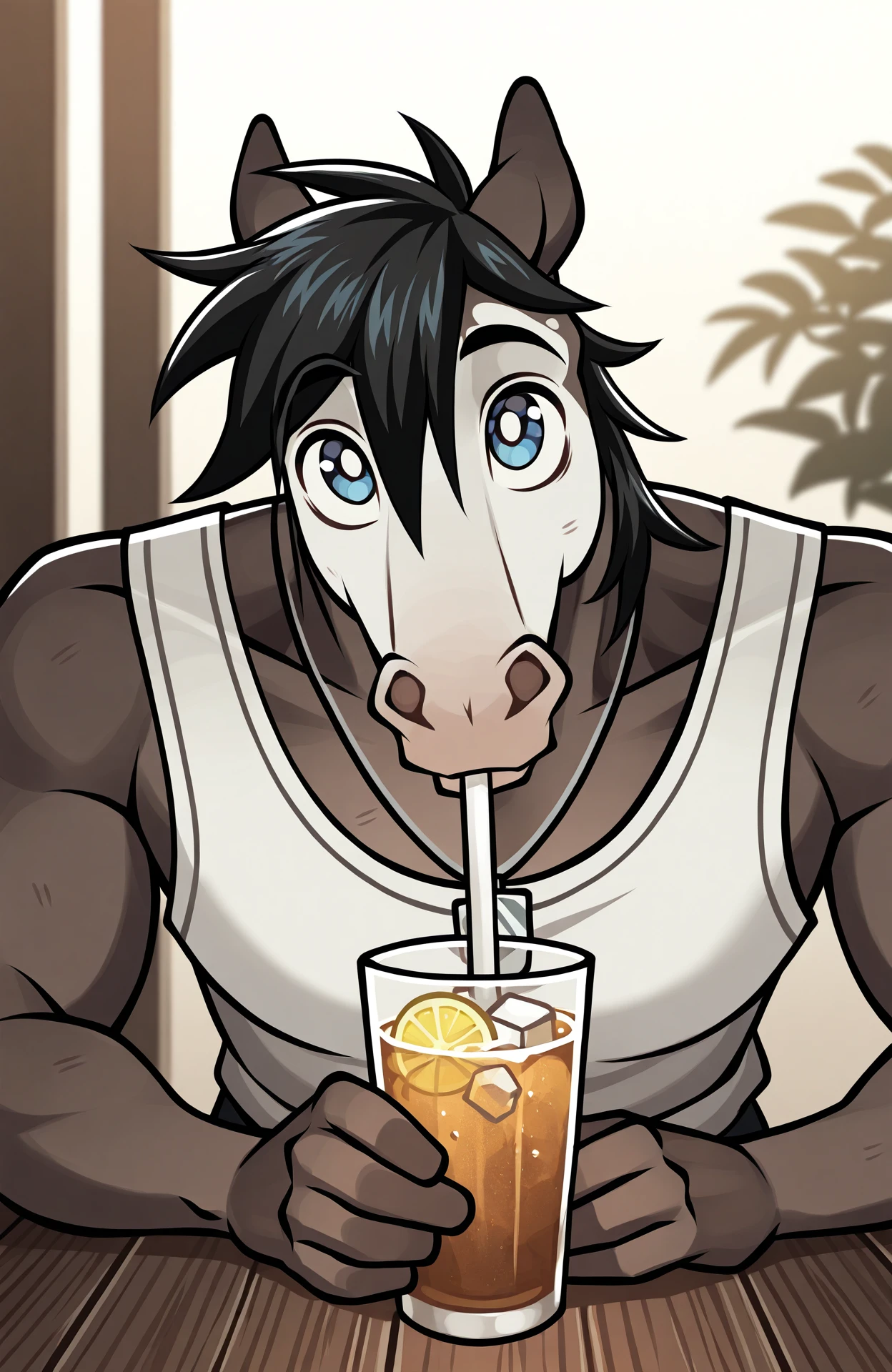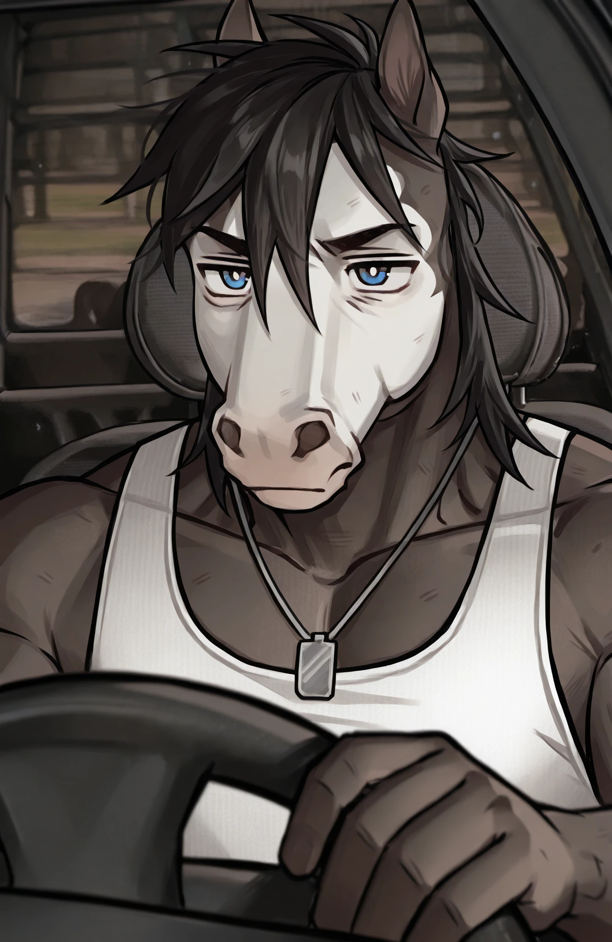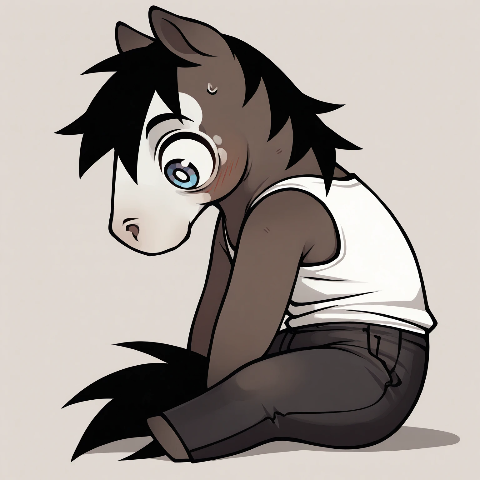 thndr, 1boy, white tank top, blue eyes with white pupils, black hair, brown horse, two tone fur, white face, black pants, badge around neck