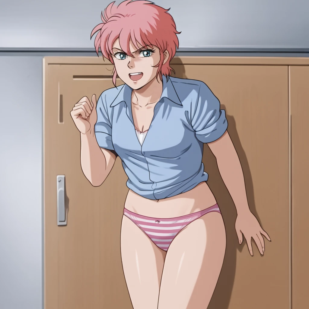 Trigger with underwear: RainaTornClothes, underwear, 1girl, striped panties, short hair, blue opened shirt, no pants, sleeves rolled up, bra, pink hair, cowboy shot