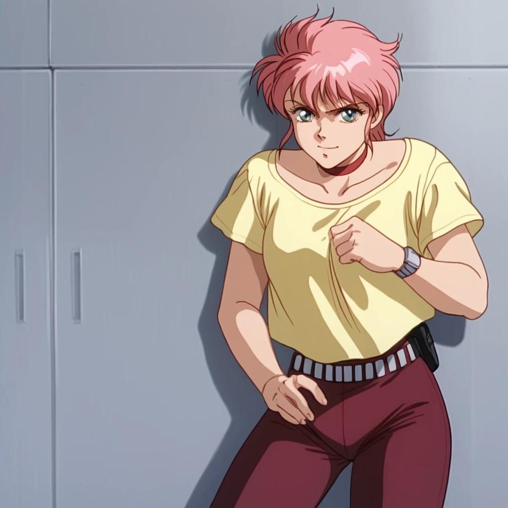 Trigger with yellow shirt: RainaYellowShirt, 1girl, retro artstyle, pink hair, short hair, choker, yellow shirt, wristwatch, dark red long pants, watch, 1990s (style), 1980s (style), cowboy shot