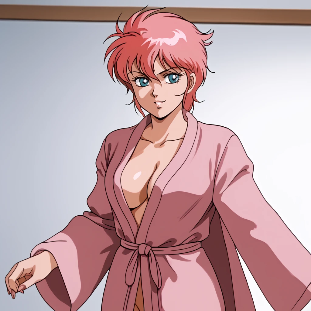 Trigger with oversized shirt: RainaShirt, 1girl, short hair, oversized shirt, pink hair, sleeves rolled up, retro artstyle, cowboy shot, no pants