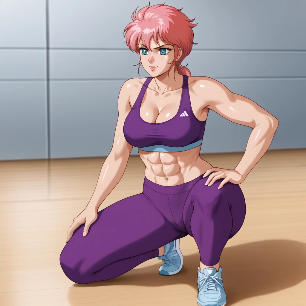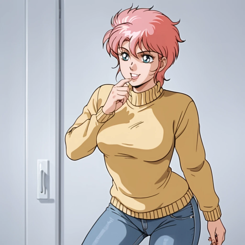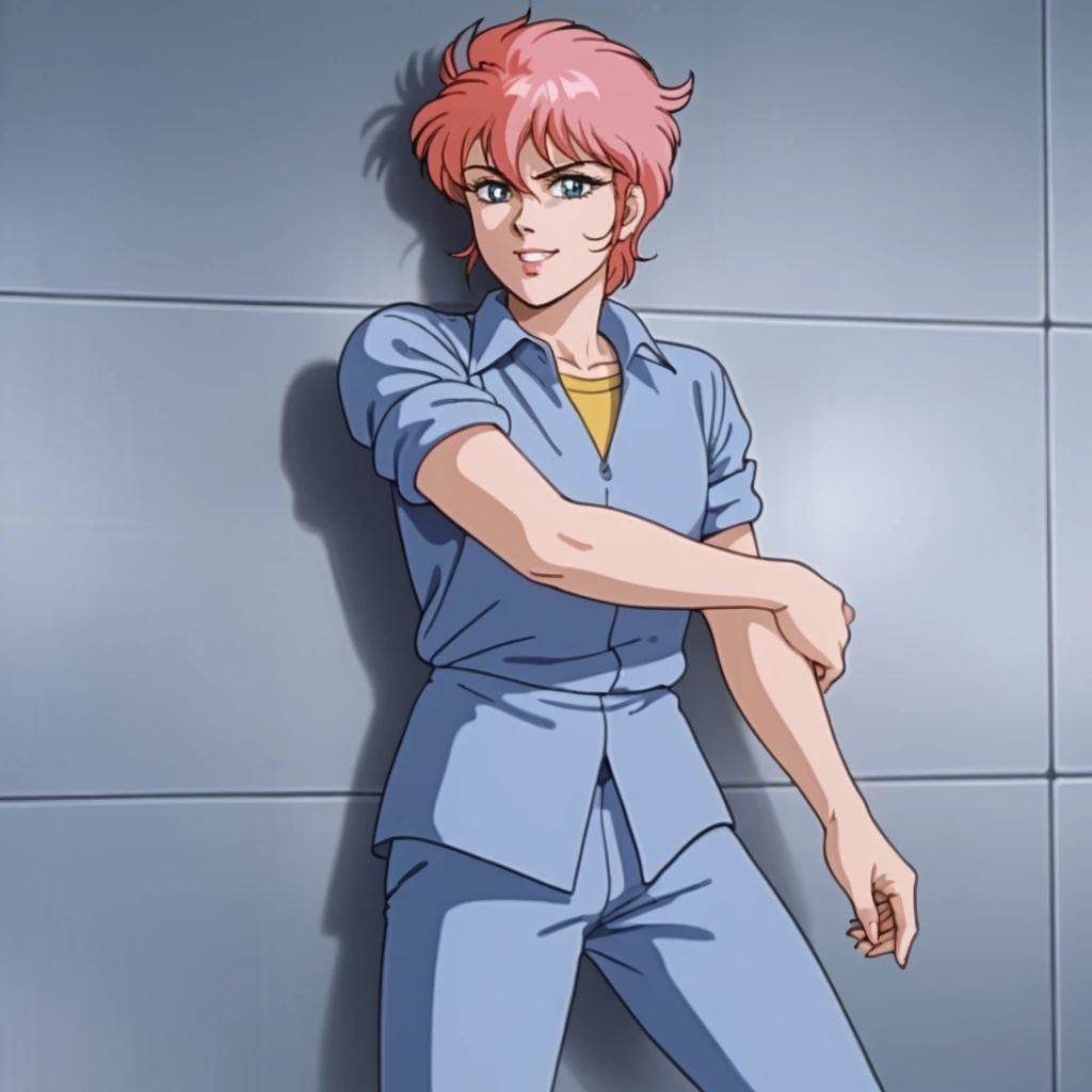 Trigger : Raina, 1980s (style), retro artstyle, short hair, 1girl, solo, pink hair, blue shirt, yellow undershirt, blue eyes, sleeves rolled up, blue pants, cowboy shot