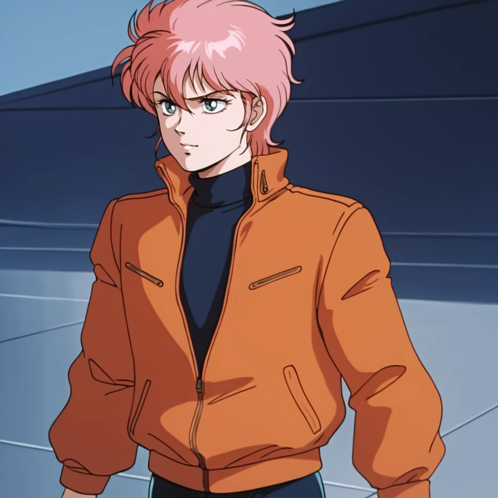 Trigger with jacket: RainaJacket, orange jacket, slightly closed jacket, solo, pink hair, pants, retro artstyle, 1980s (style), turtleneck, short hair, cowboy shot,