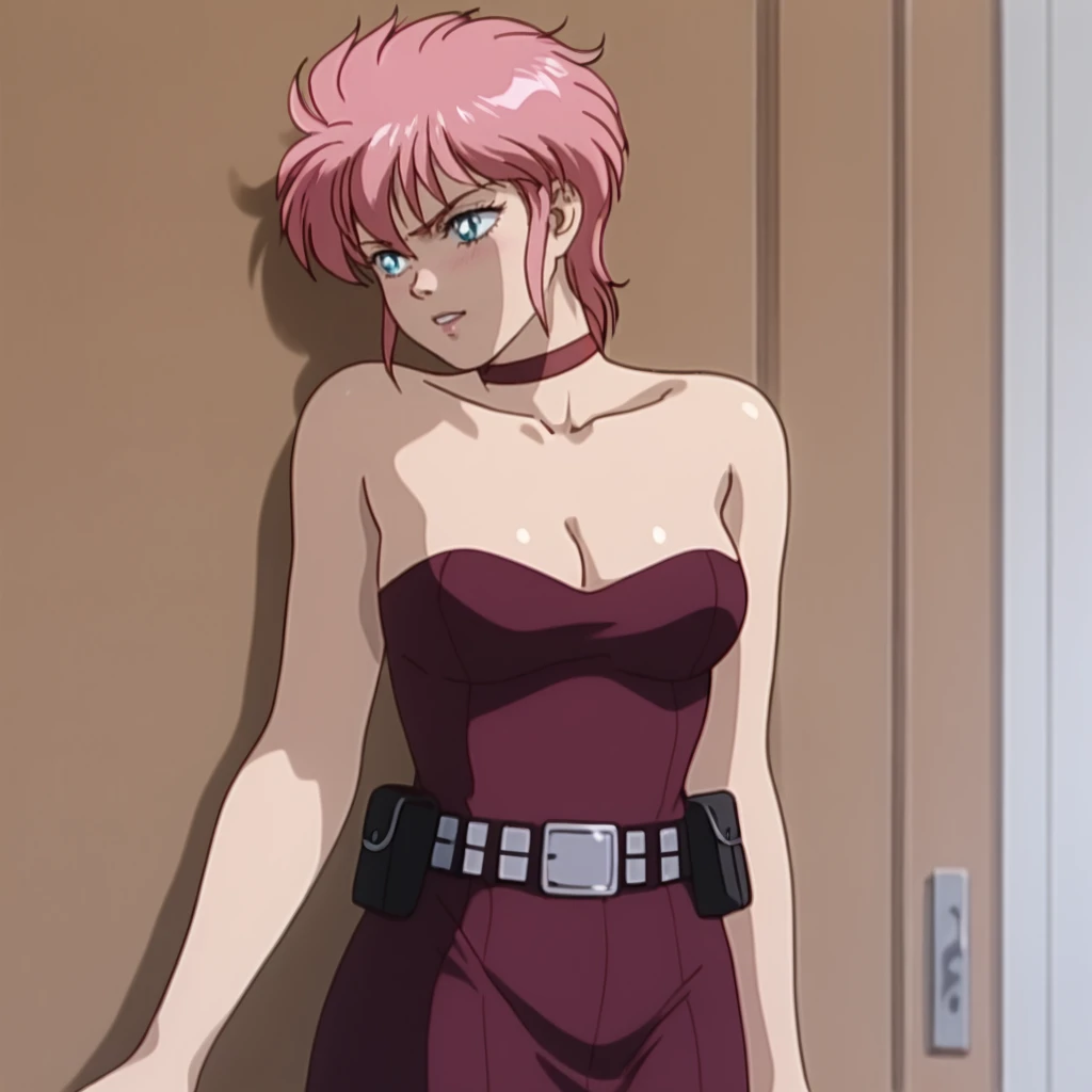 Trigger with spy clothes: RainaSpy, 1girl, short hair, pink hair, choker, blue eyes, dress, bare shoulders, breasts, belt, cleavage, strapless, cowboy shot