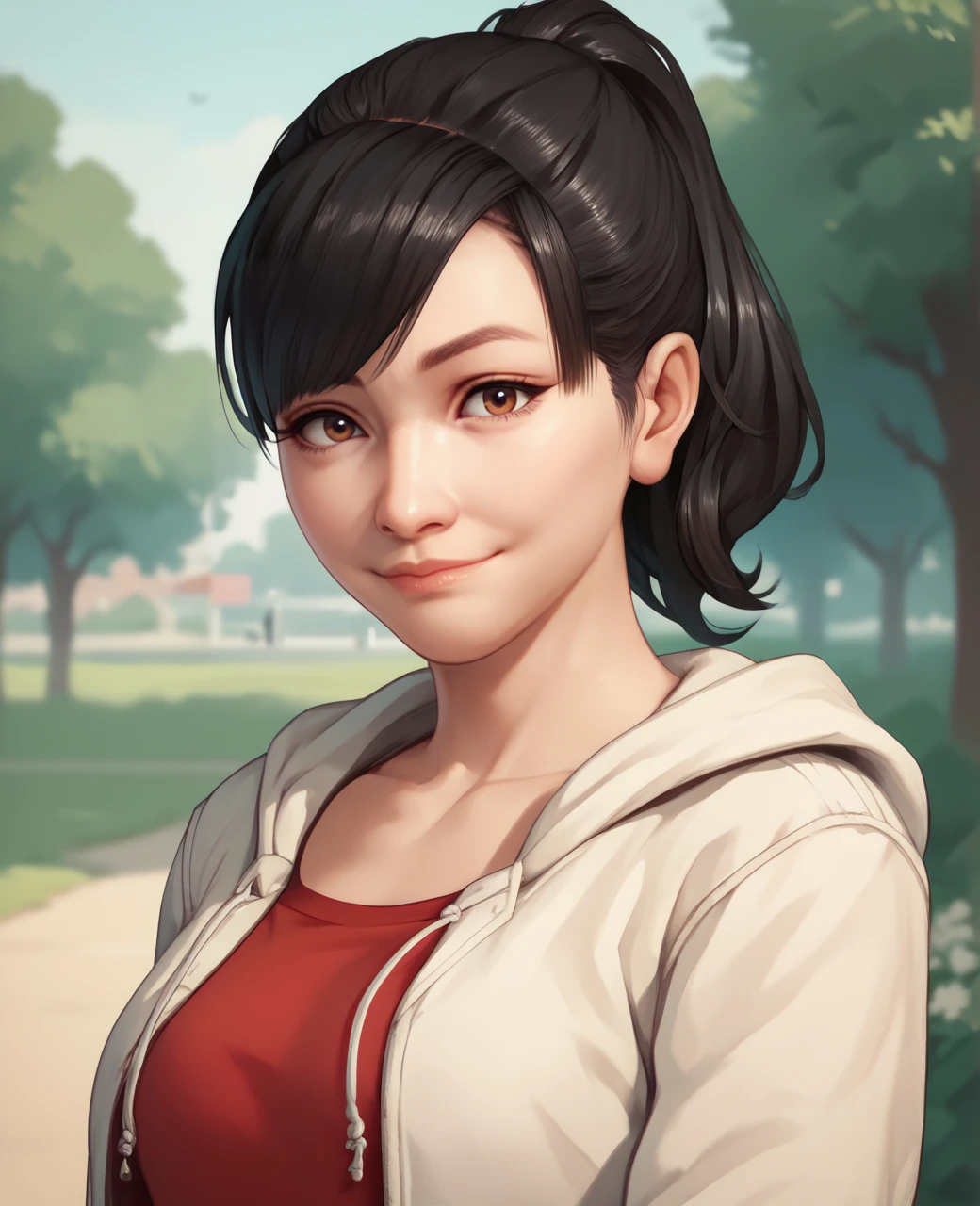 black hair, brown eyes, - ponytail, bang, or long hair,