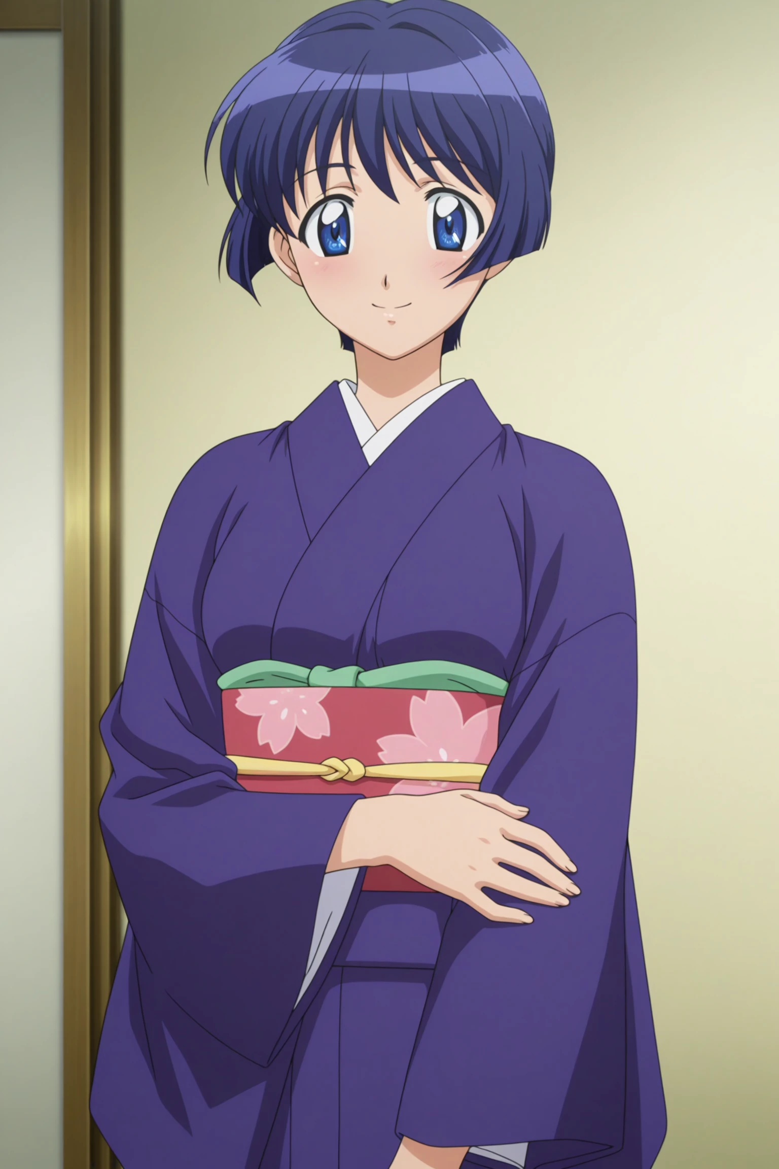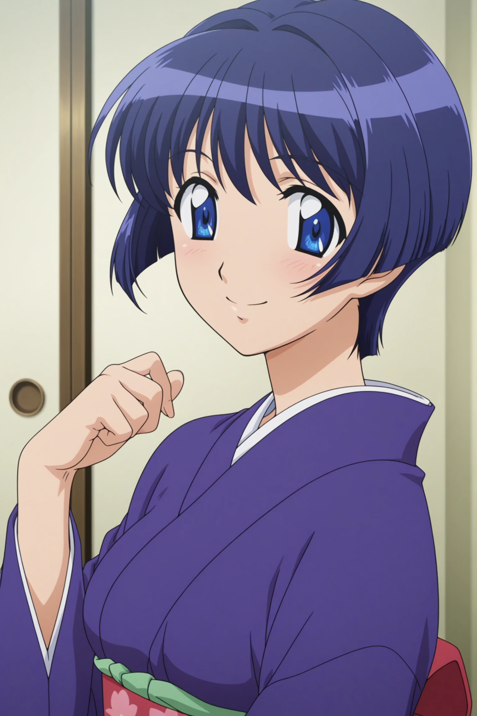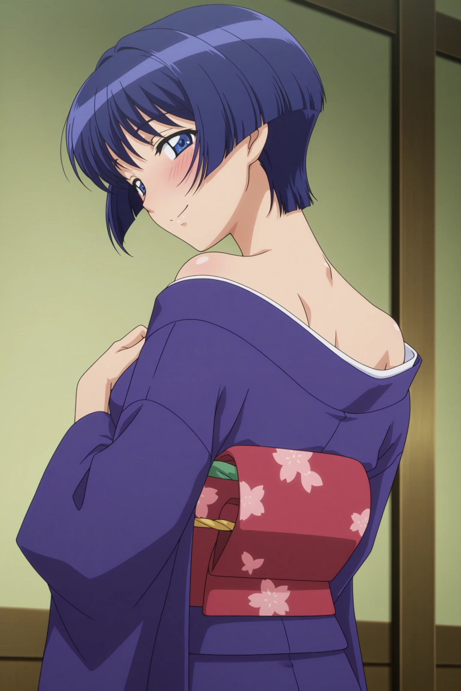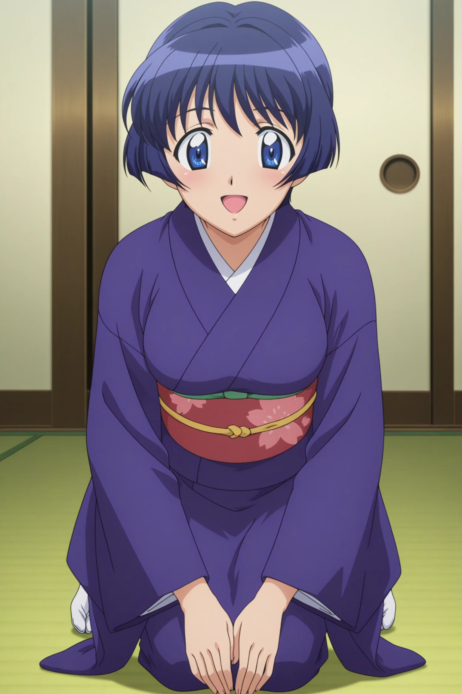 sakuraba aoi, blue hair, short hair, bob cut, blue eyes, japanese clothes, long sleeves, purple kimono, obi, obiage, obijime, obidome, tabi, white legwear, zouri