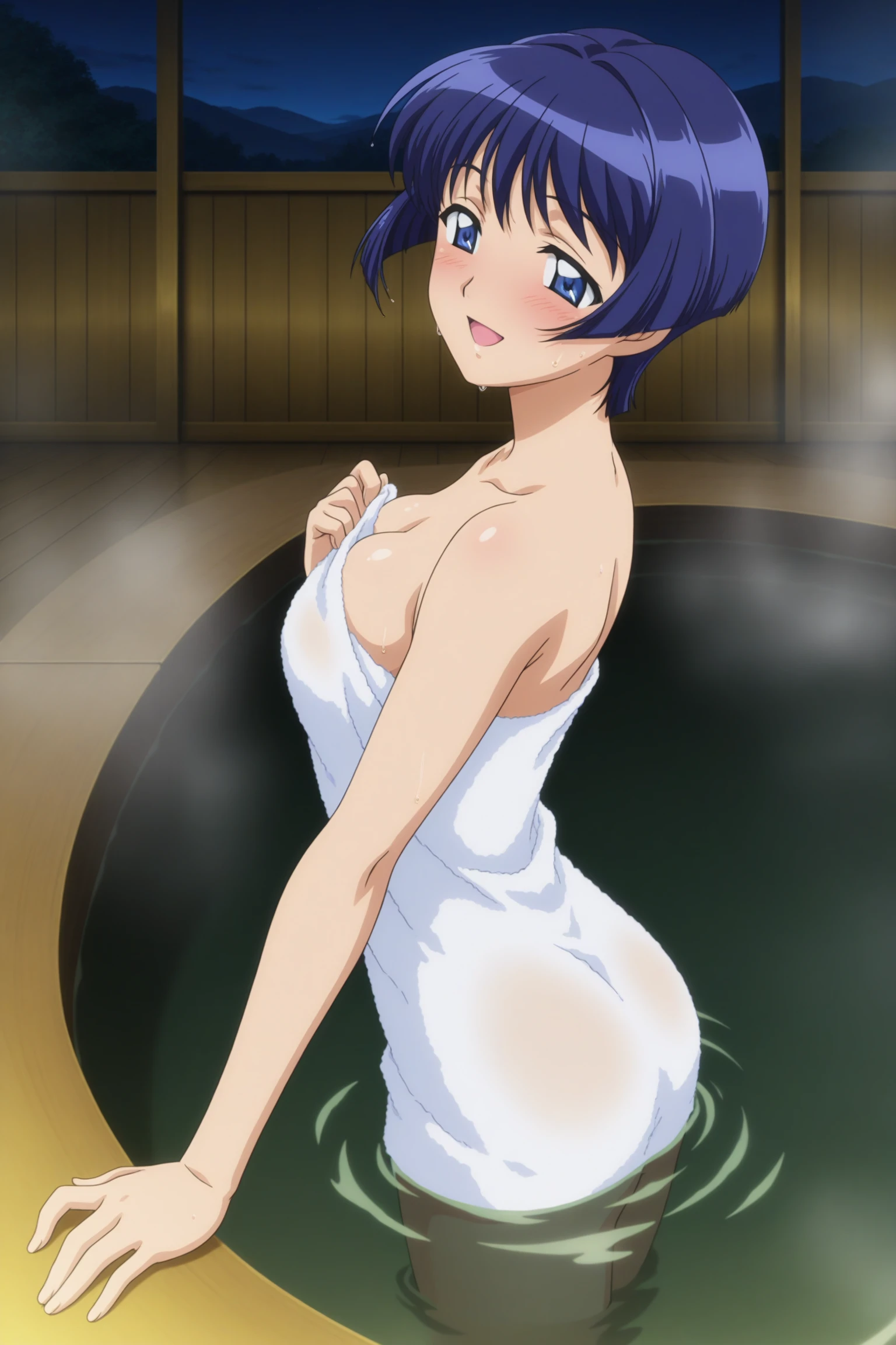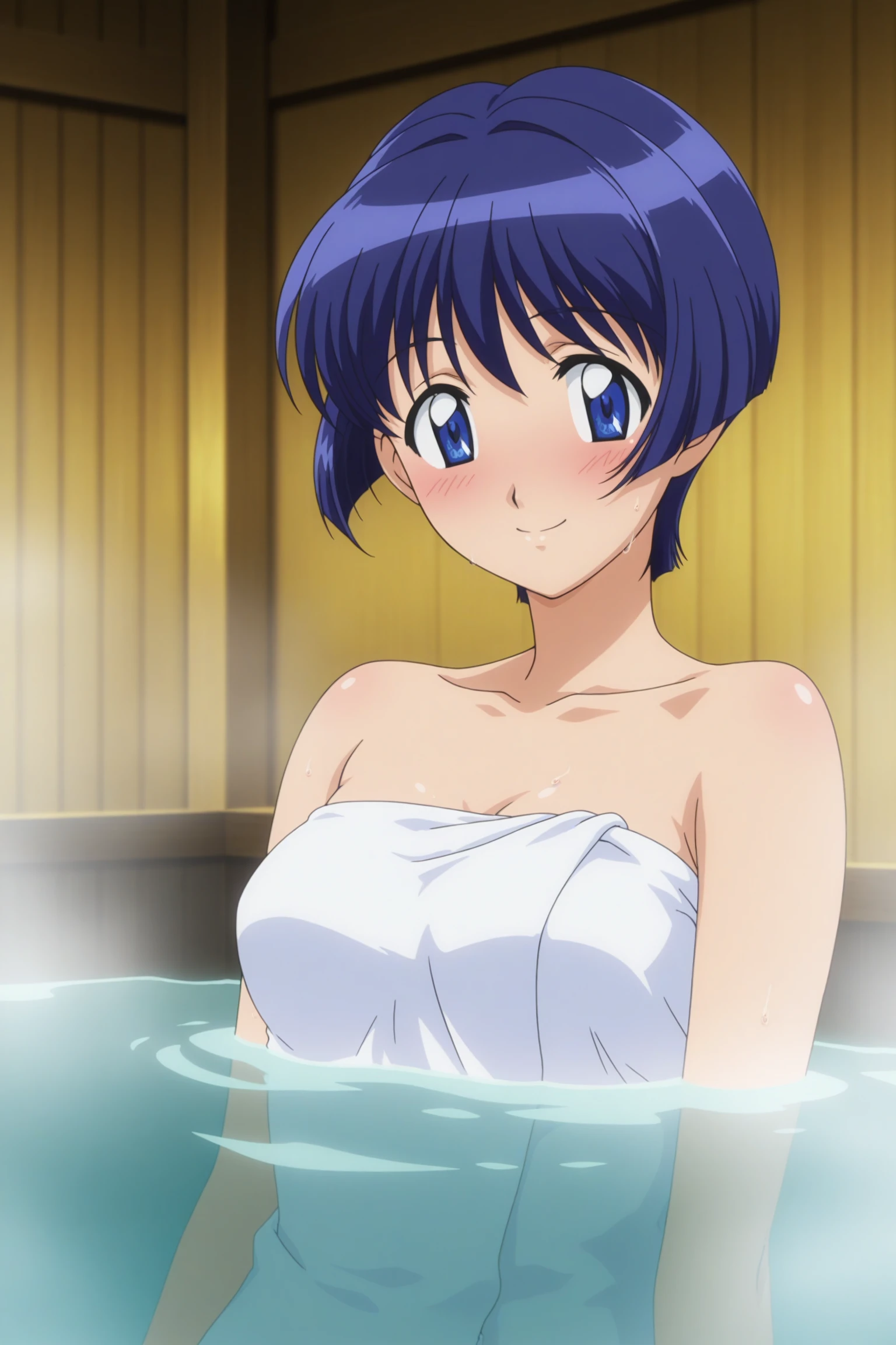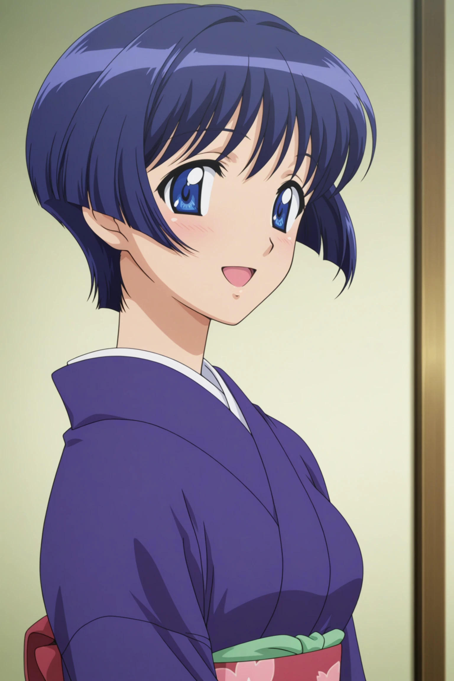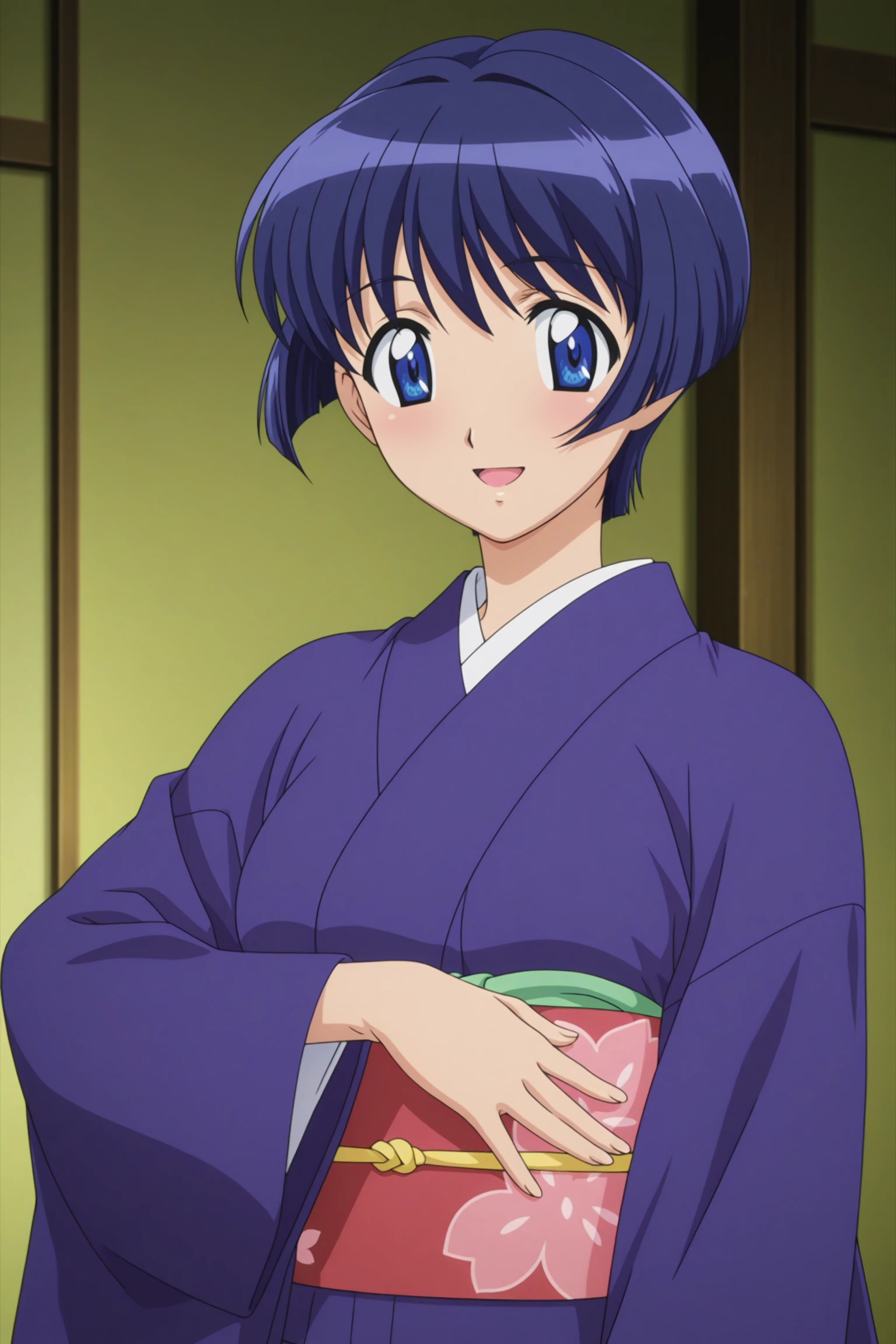 sakuraba aoi, blue hair, short hair, bob cut, blue eyes, japanese clothes, long sleeves, purple kimono, obi, obiage, obijime, obidome, tabi, white legwear, zouri