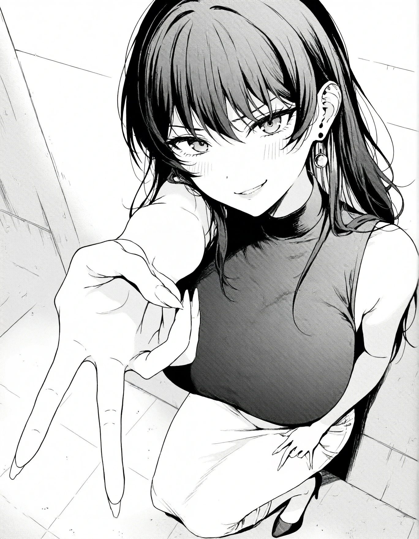 minami, brown hair, long hair, grey eyes, earring, shirt, sleeveless, high collar, long skirt, kneels,