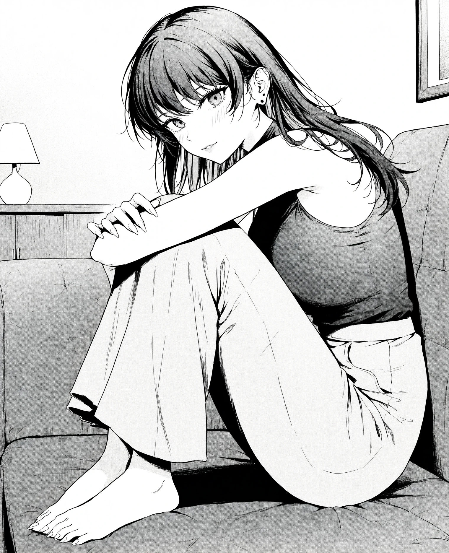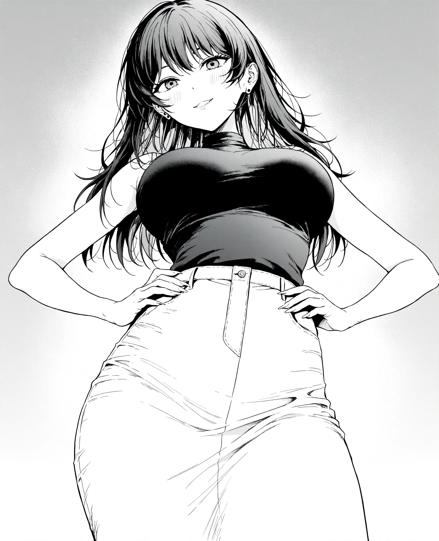 minami, brown hair, long hair, grey eyes, earring, shirt, long sleeves, neck ruban, neck ribbon, ribbon around neck, jeans, denim jeans, collarbone,