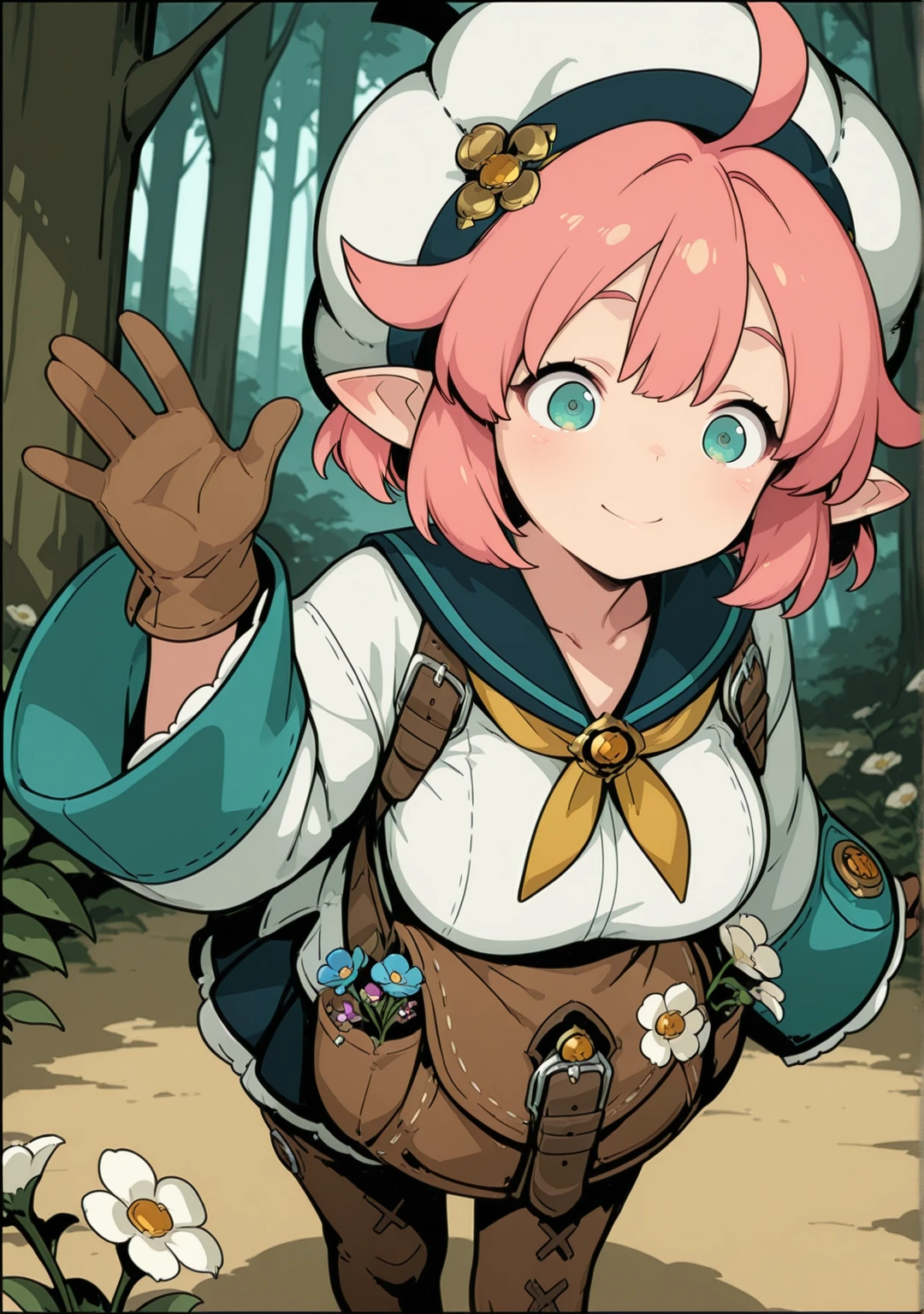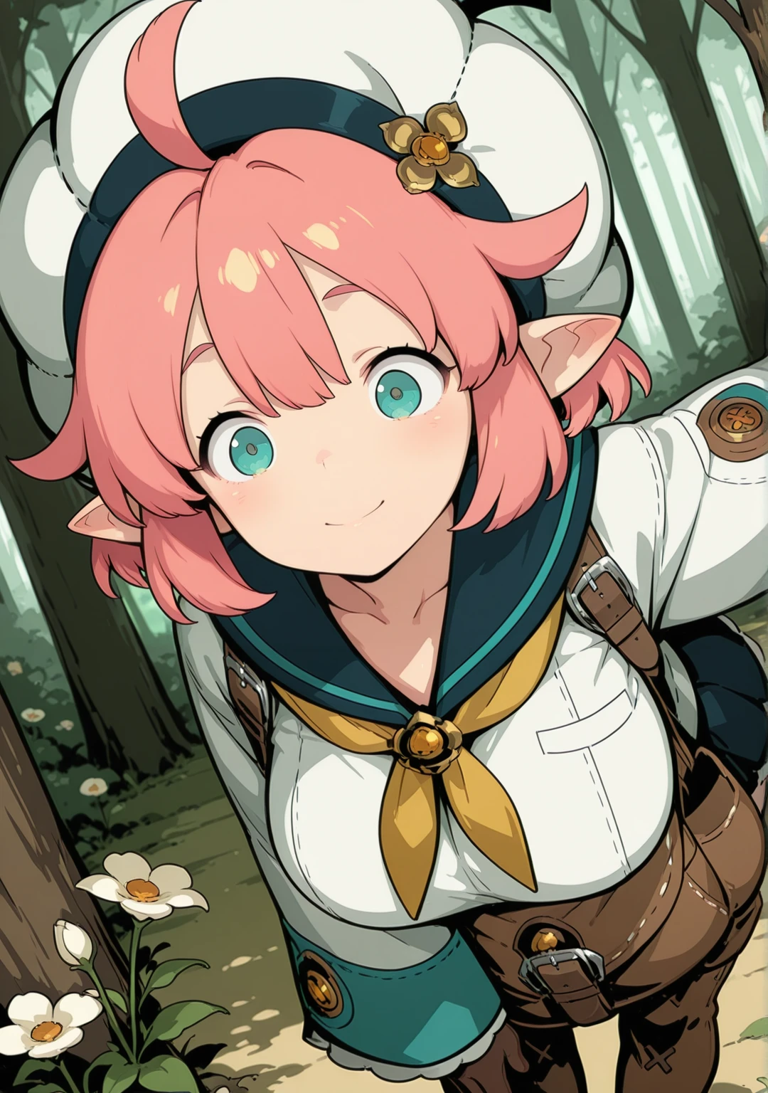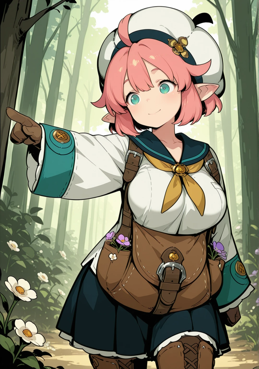 recommend:pink hair,aqua eyes,short hair,beret,white shirt,white headwear,ahoge,brown gloves,wide sleeves,flower,green eyes,sleeves past wrists,long sleeves,brown footwear,pleated skirt, black skirt,yellow neckerchief,pointy ears,blue sailor collar,blue skirt,