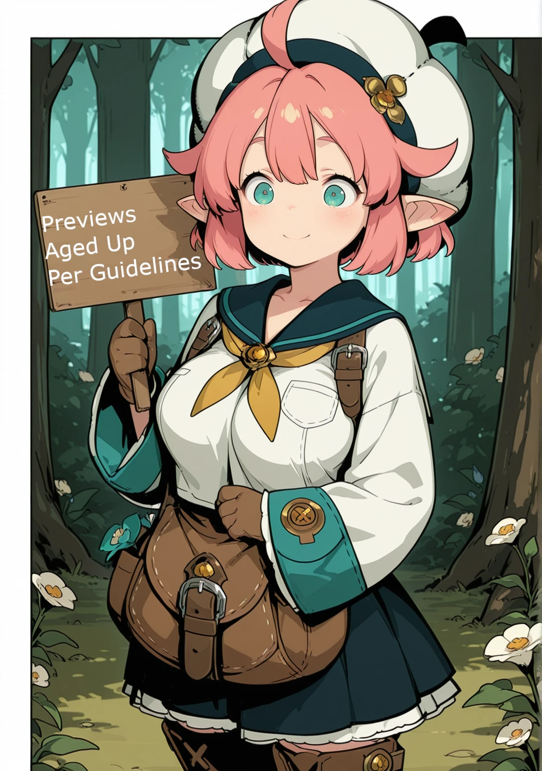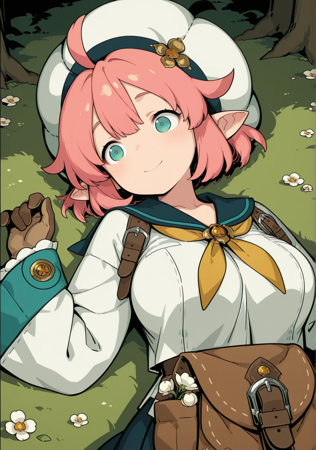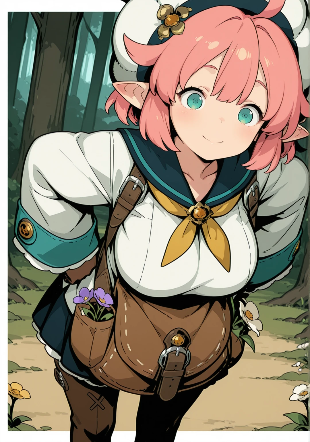 recommend:pink hair,aqua eyes,short hair,beret,white shirt,white headwear,ahoge,brown gloves,wide sleeves,flower,green eyes,sleeves past wrists,long sleeves,brown footwear,pleated skirt, black skirt,yellow neckerchief,pointy ears,blue sailor collar,blue skirt,