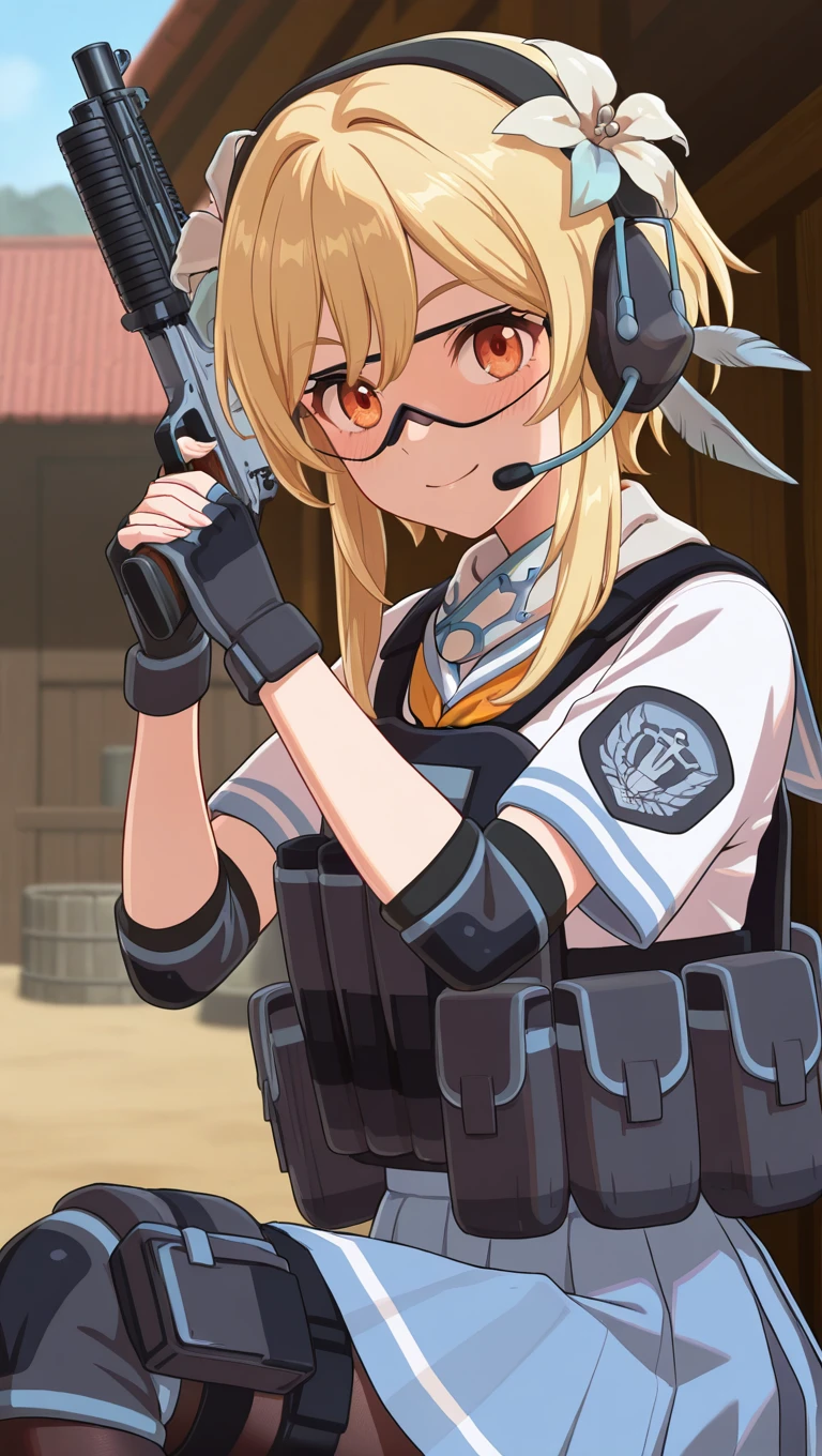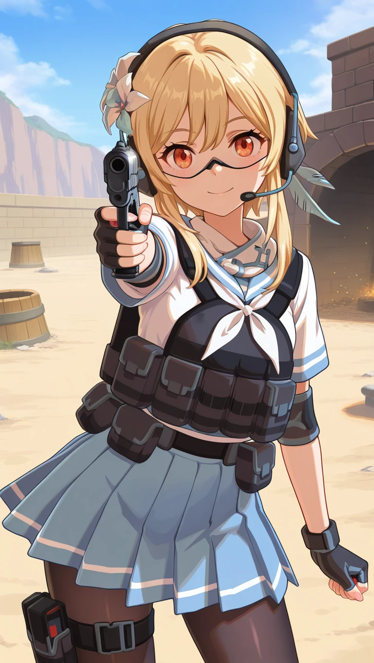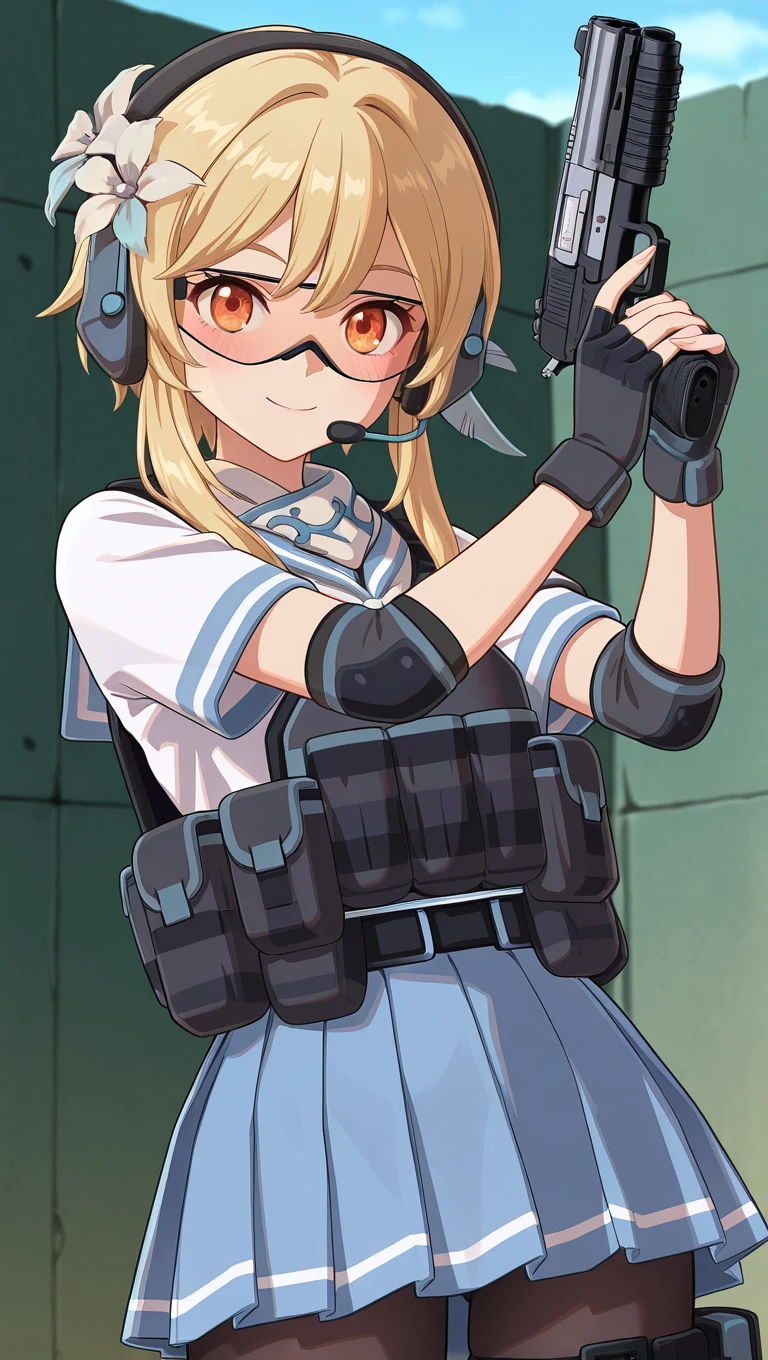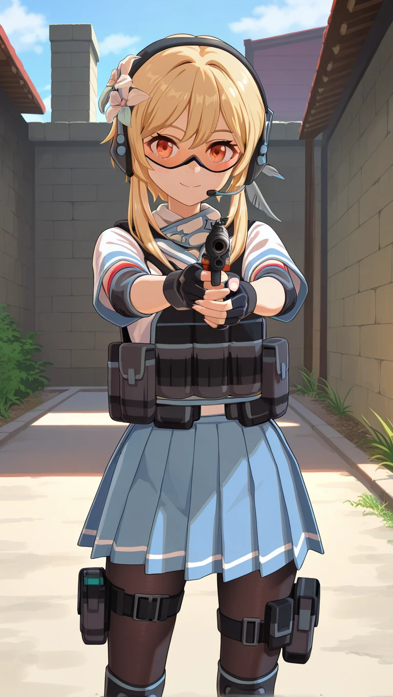 alternate costume,neckerchief,bulletproof vest,load bearing vest,white shirt,short sleeves,elbow pads,black gloves,fingerless gloves,blue skirt,pleated skirt,pouch,black pantyhose,thigh strap,knee pads,lace-up boots,black footwear