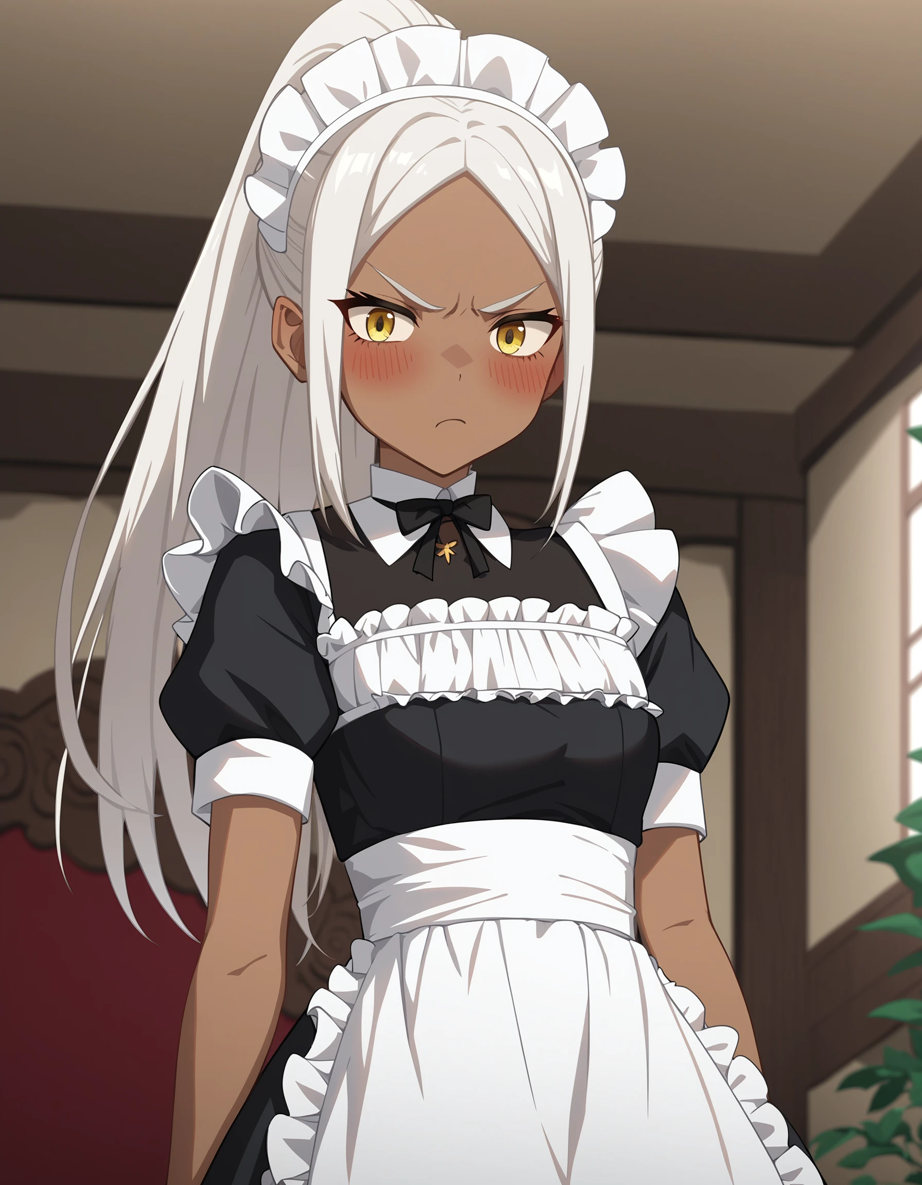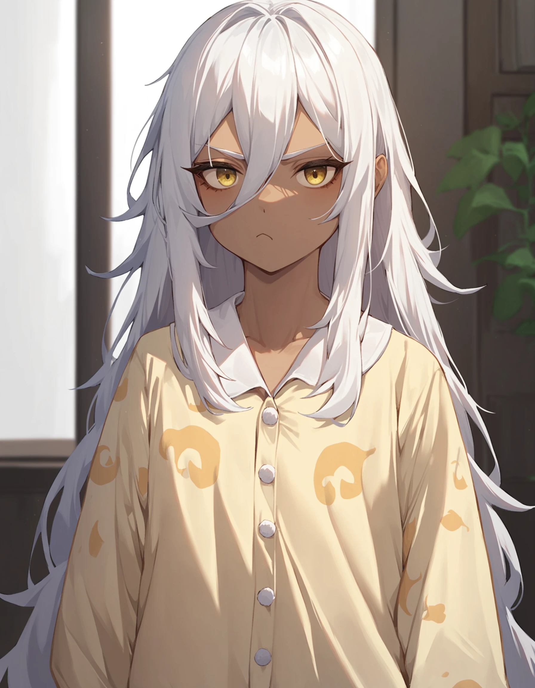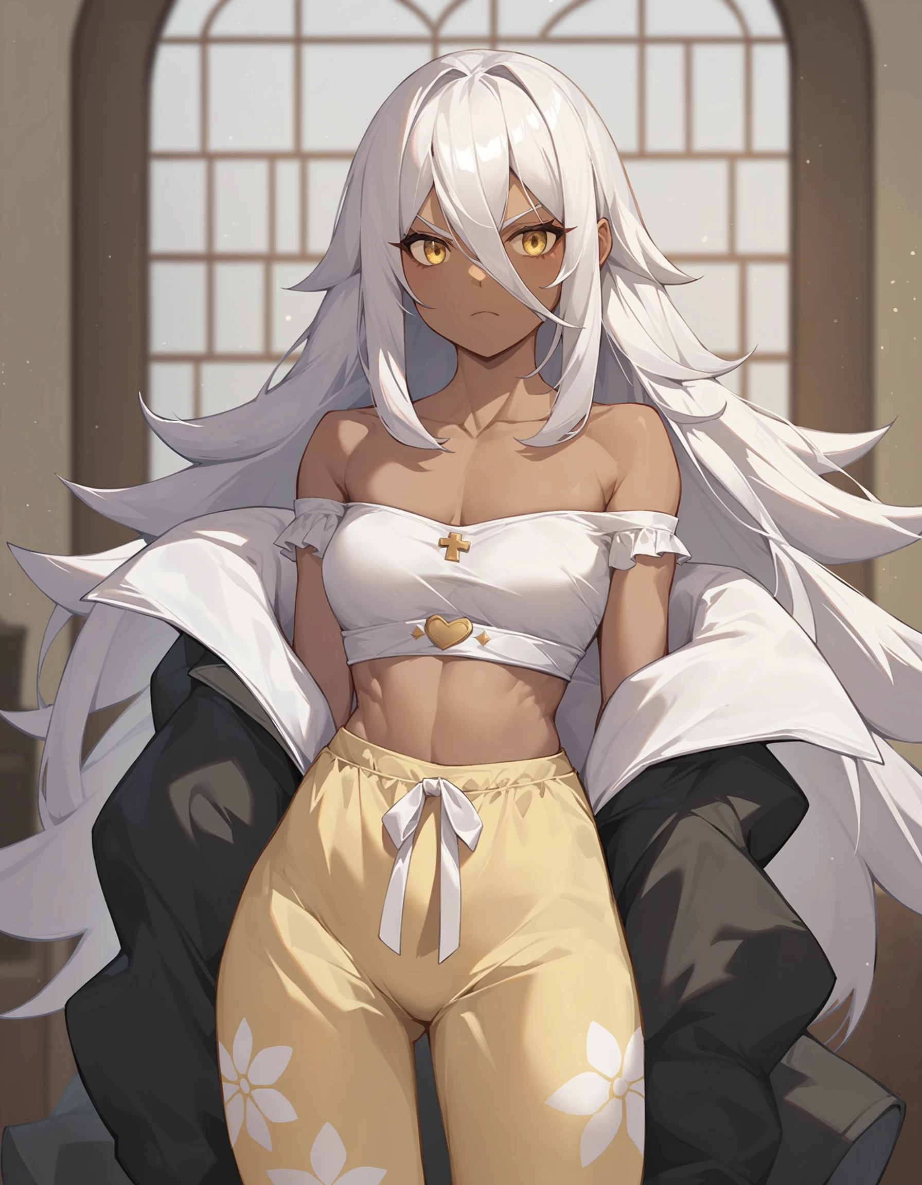 namu snowbreak,1girl,solo,long hair,dark-skinned female,dark skin,white hair,jacket,hair between eyes,yellow eyes,shirt,off shoulder,open clothes,white shirt,Please support the game and the artist. This model is only for research purposes!
