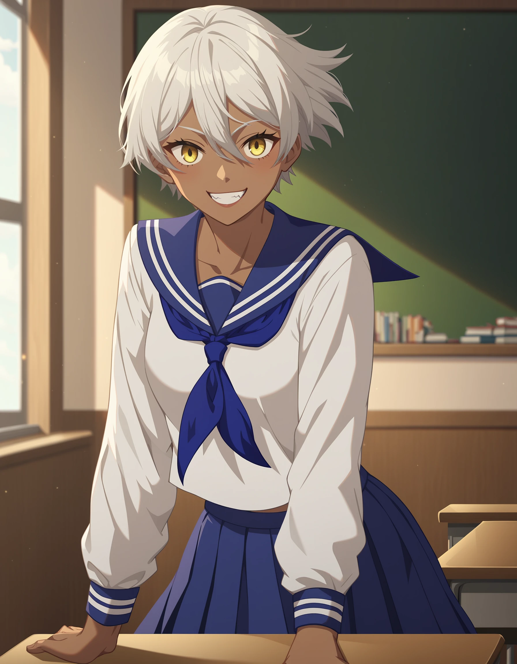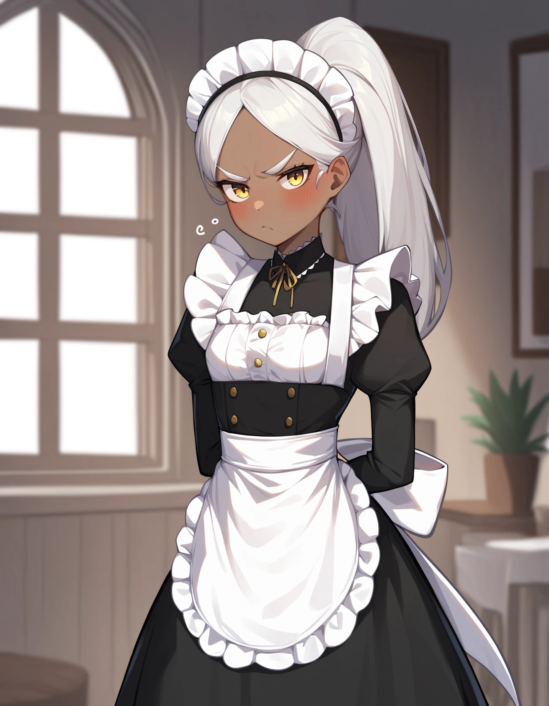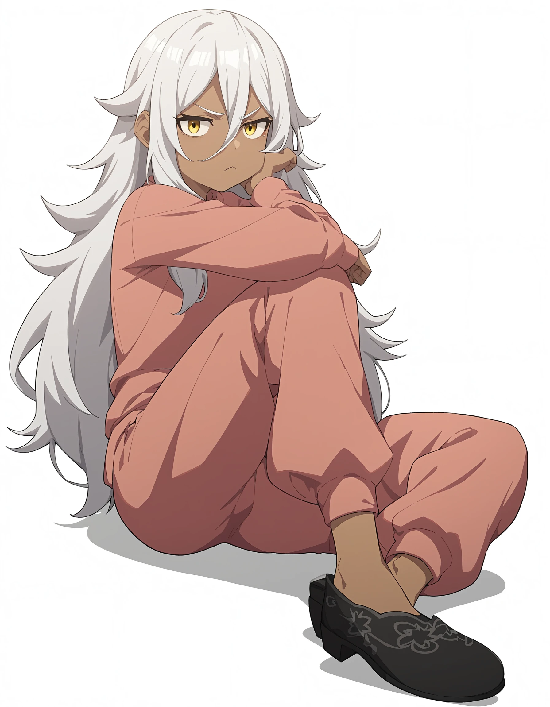 namu snowbreak,1girl,solo,long hair,dark-skinned female,dark skin,white hair,jacket,hair between eyes,yellow eyes,shirt,off shoulder,open clothes,white shirt,Please support the game and the artist. This model is only for research purposes!