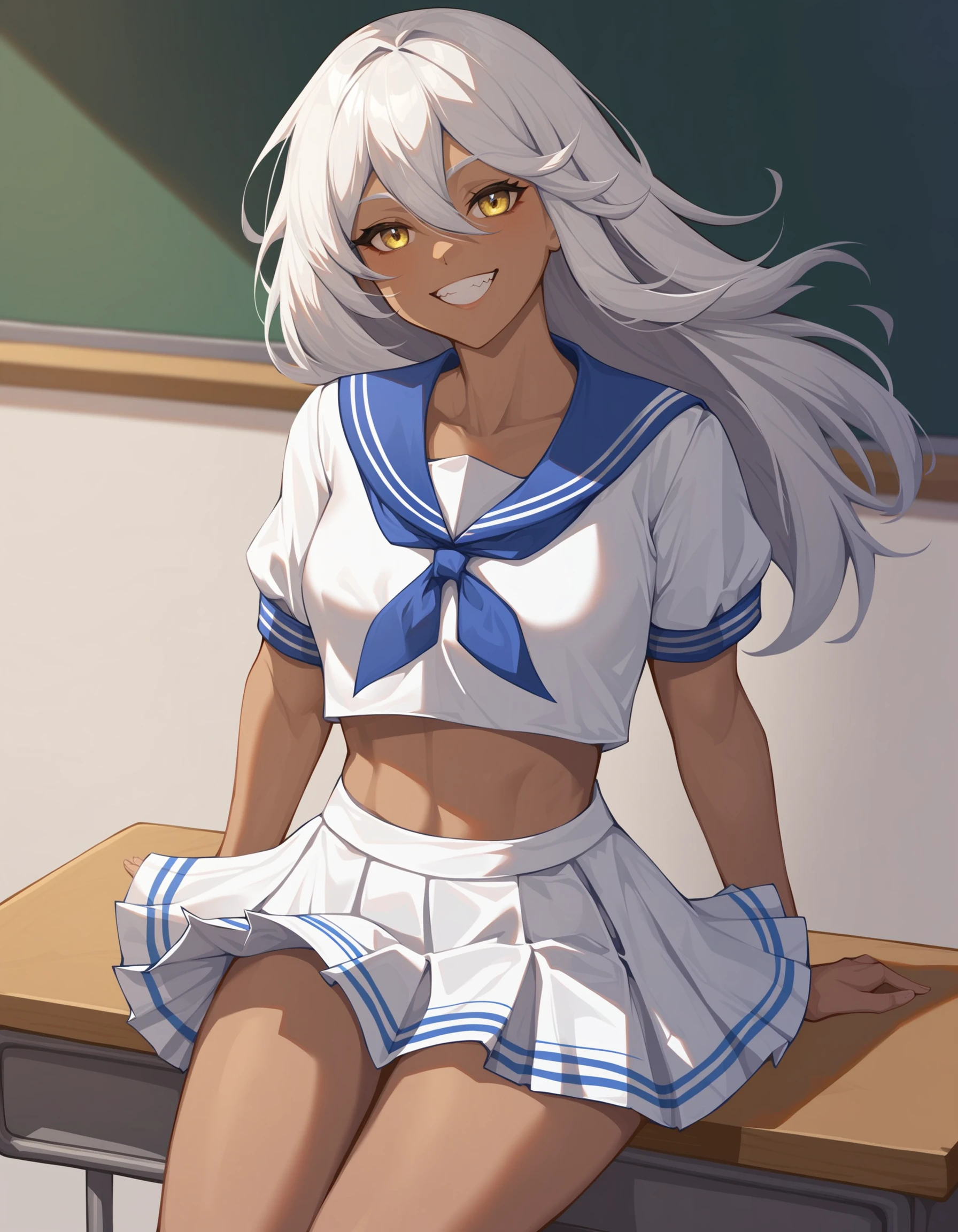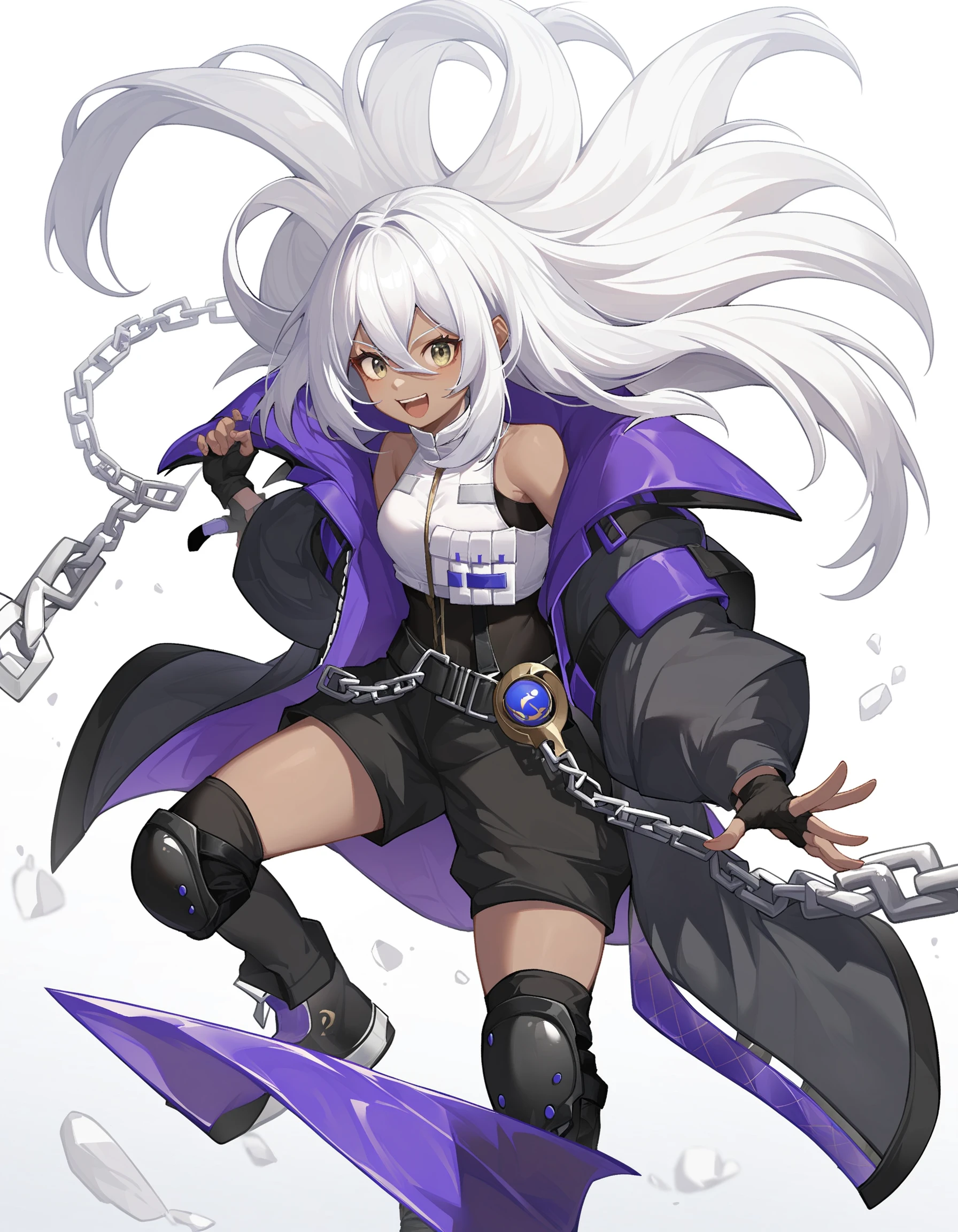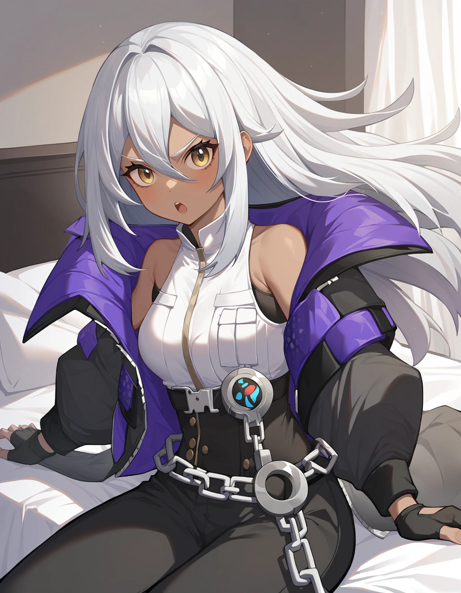 namu snowbreak,1girl,solo,long hair,dark-skinned female,dark skin,white hair,jacket,hair between eyes,yellow eyes,shirt,off shoulder,open clothes,white shirt,Description