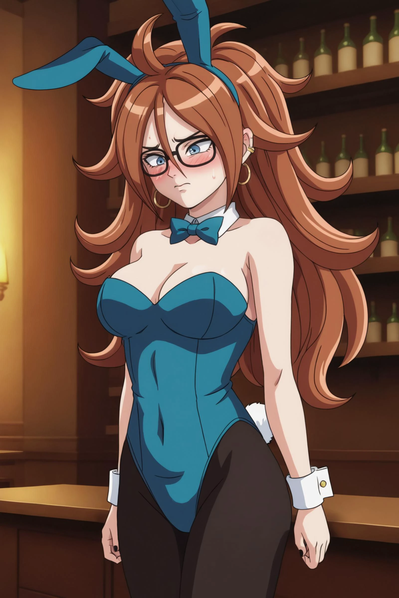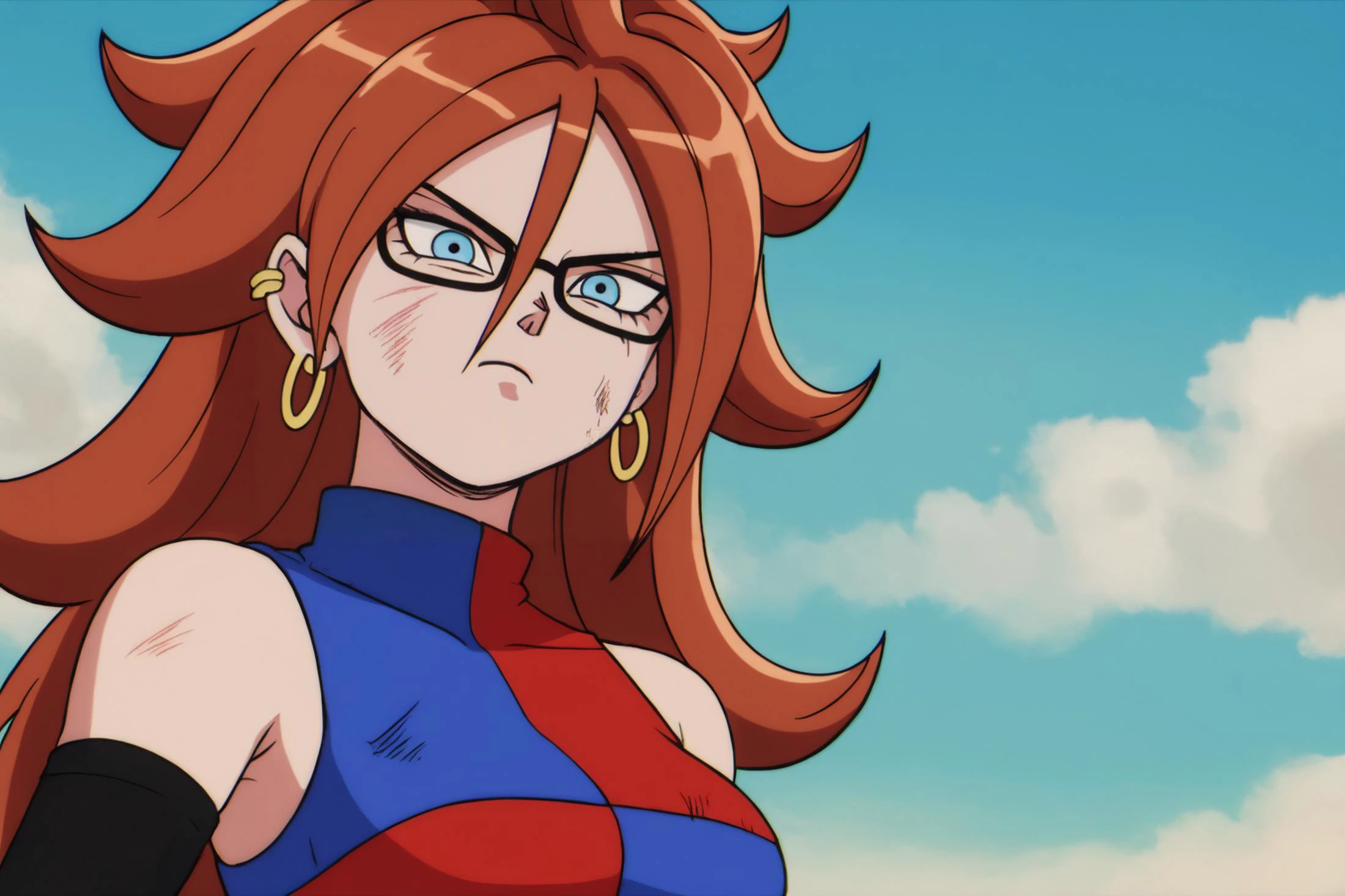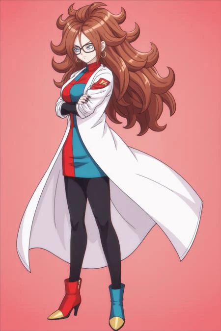 android 21, human, long hair, blue eyes, brown hair, hair between eyes, earclip, hoop earrings, nail polish
