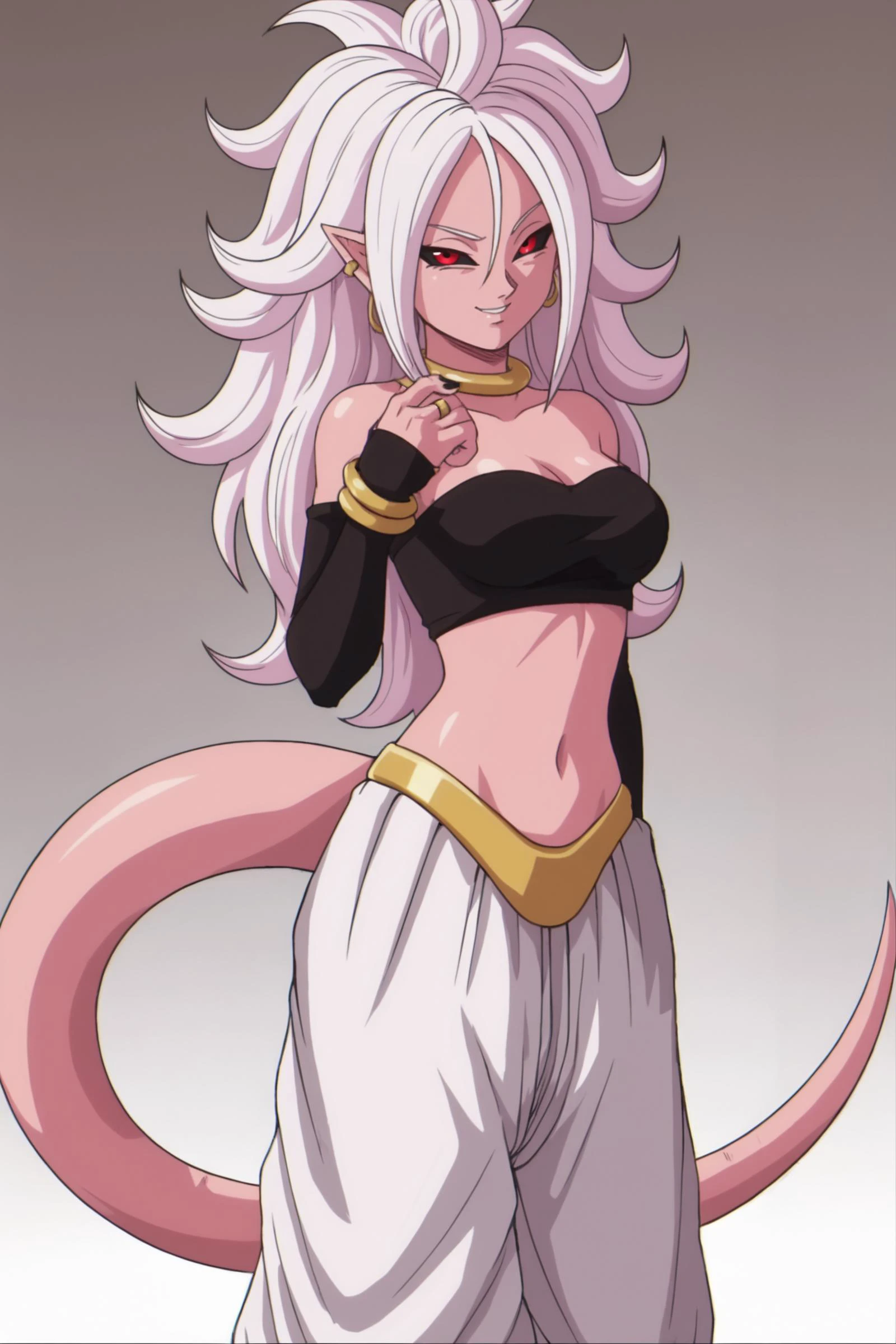 android 21, majin, pink skin, pointy ears, majin eyes, nail polish, black nails, long hair, white hair, majin tail,