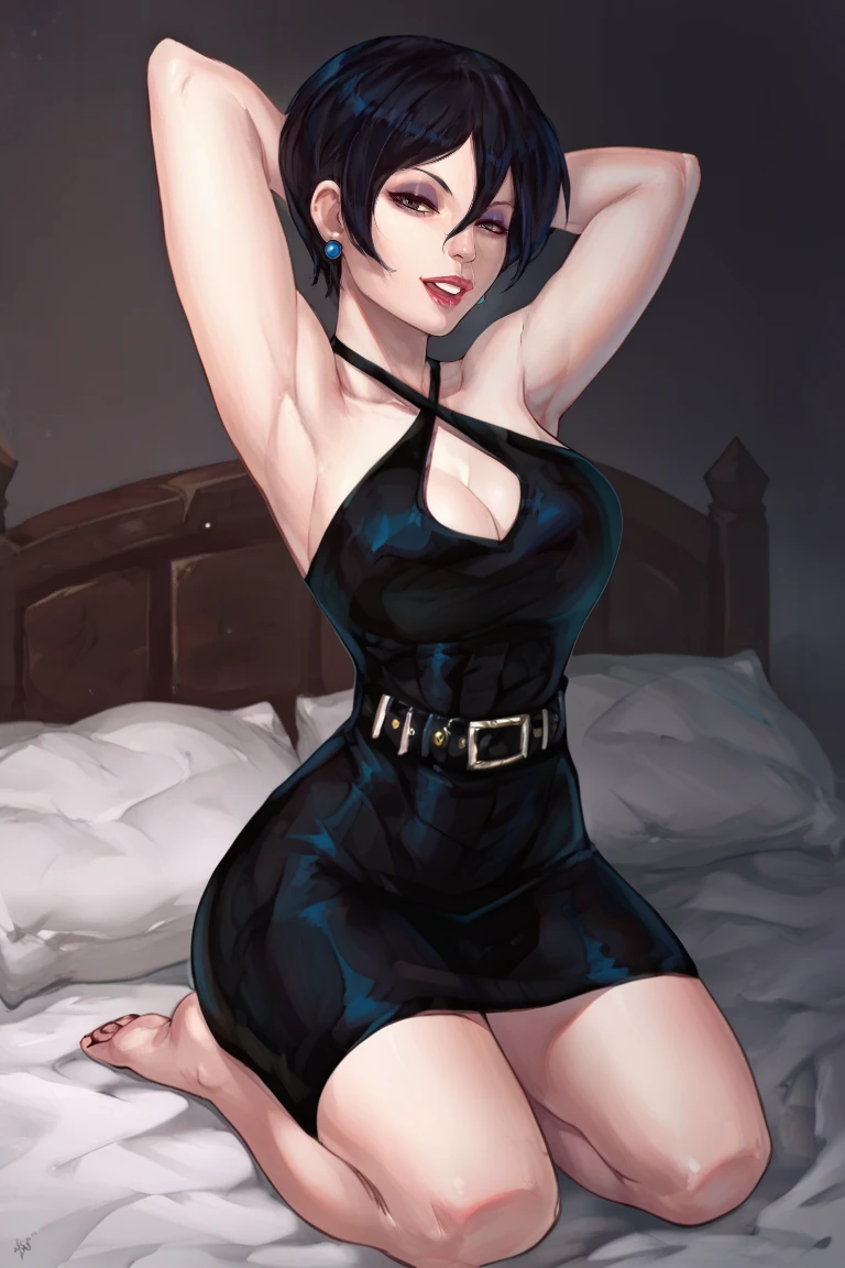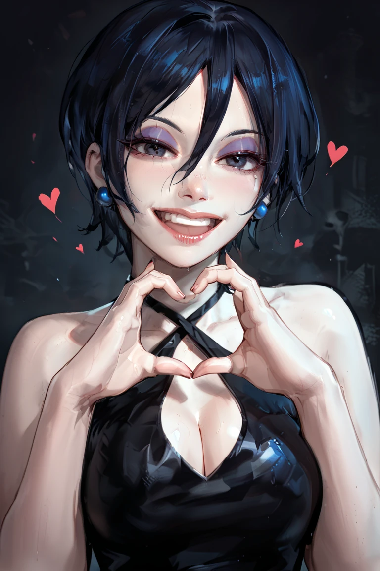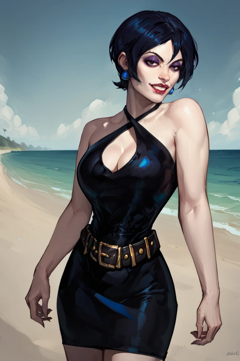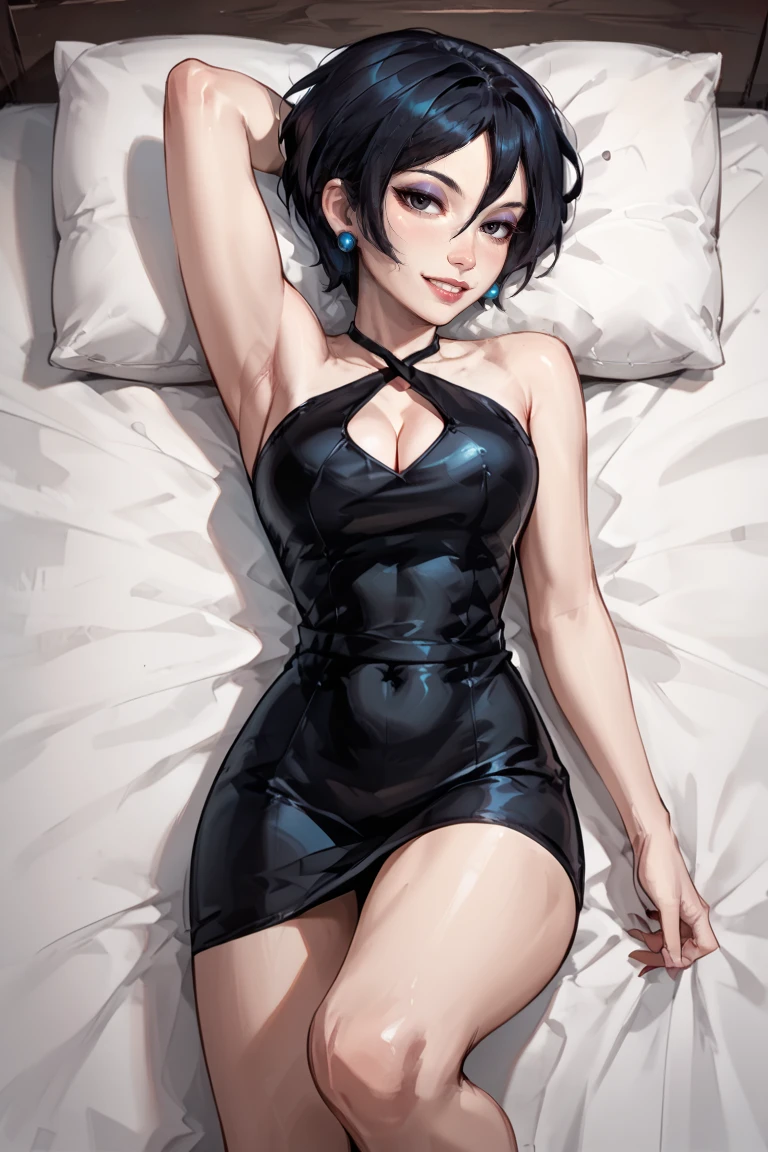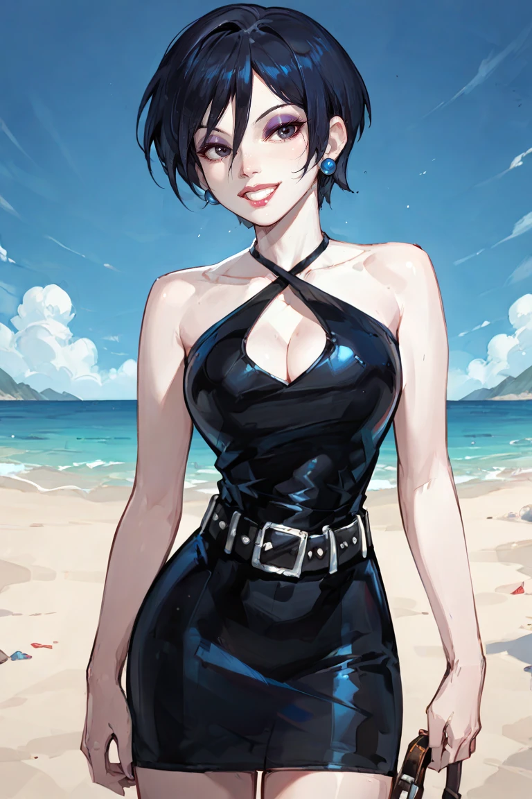 also: short hair, eye shadow, earrings, black dress, short dress, belt, cleavage,