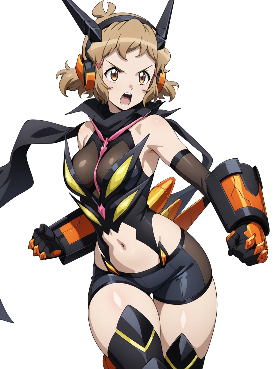 Prompts: 1girl, solo, short hair, brown hair,hair ornament, hairclip, ignitependant, navel, scarf, gloves, headgear, headphones, bodysuit, navel cutout, clothing cutout, gauntlets
