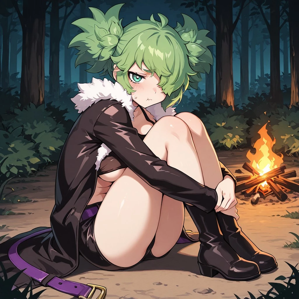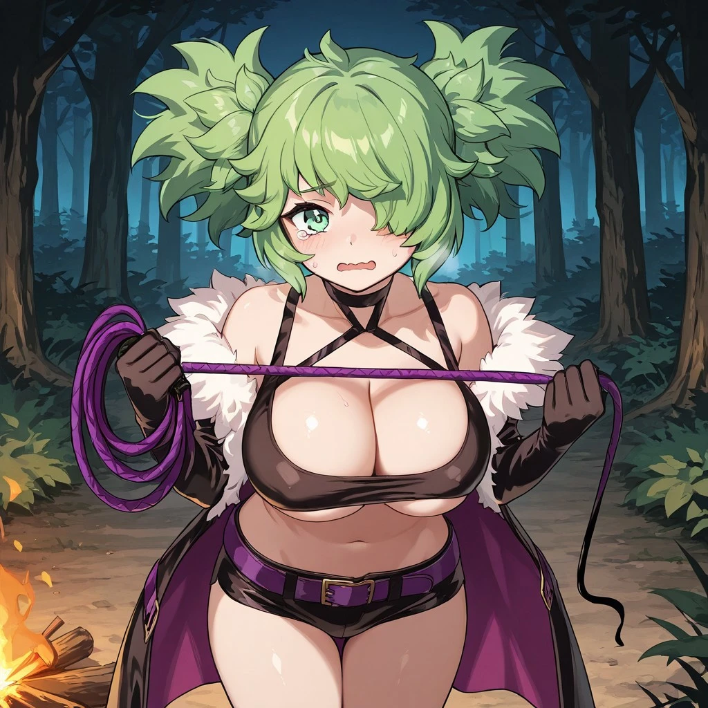 dhunter5, green hair, green eyes, hair covering eye, messy hair, fur-trimmed coat, large breasts, underboob,