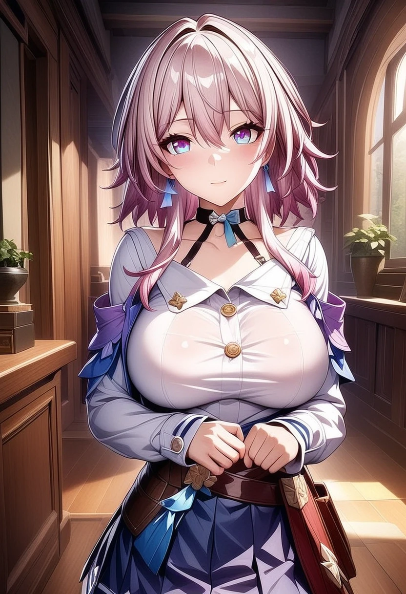 Trigger words: march_a_xl, March 7th (Honkai Star Rail), pink hair, short hair, bangs, multicolored eyes, blue eyes, pink eyes, large breasts, earrings, jewelry, choker, jacket, white shirt, long sleeves, blue skirt, pleated skirt, black partially fingerless gloves,