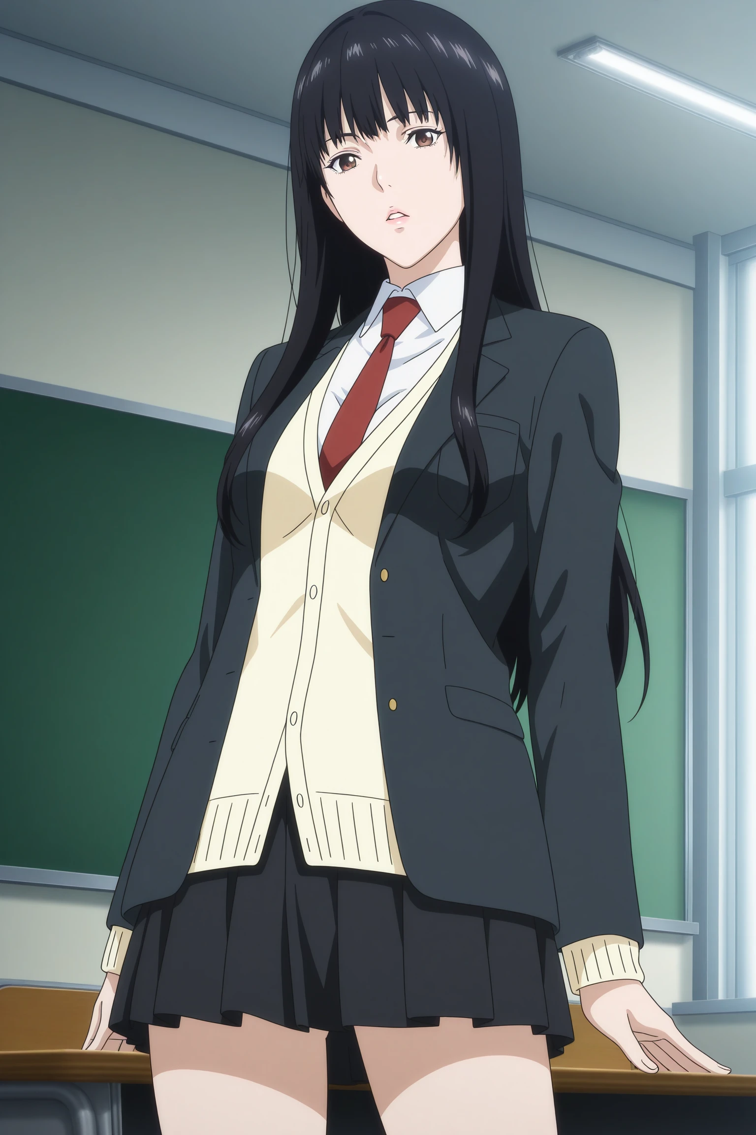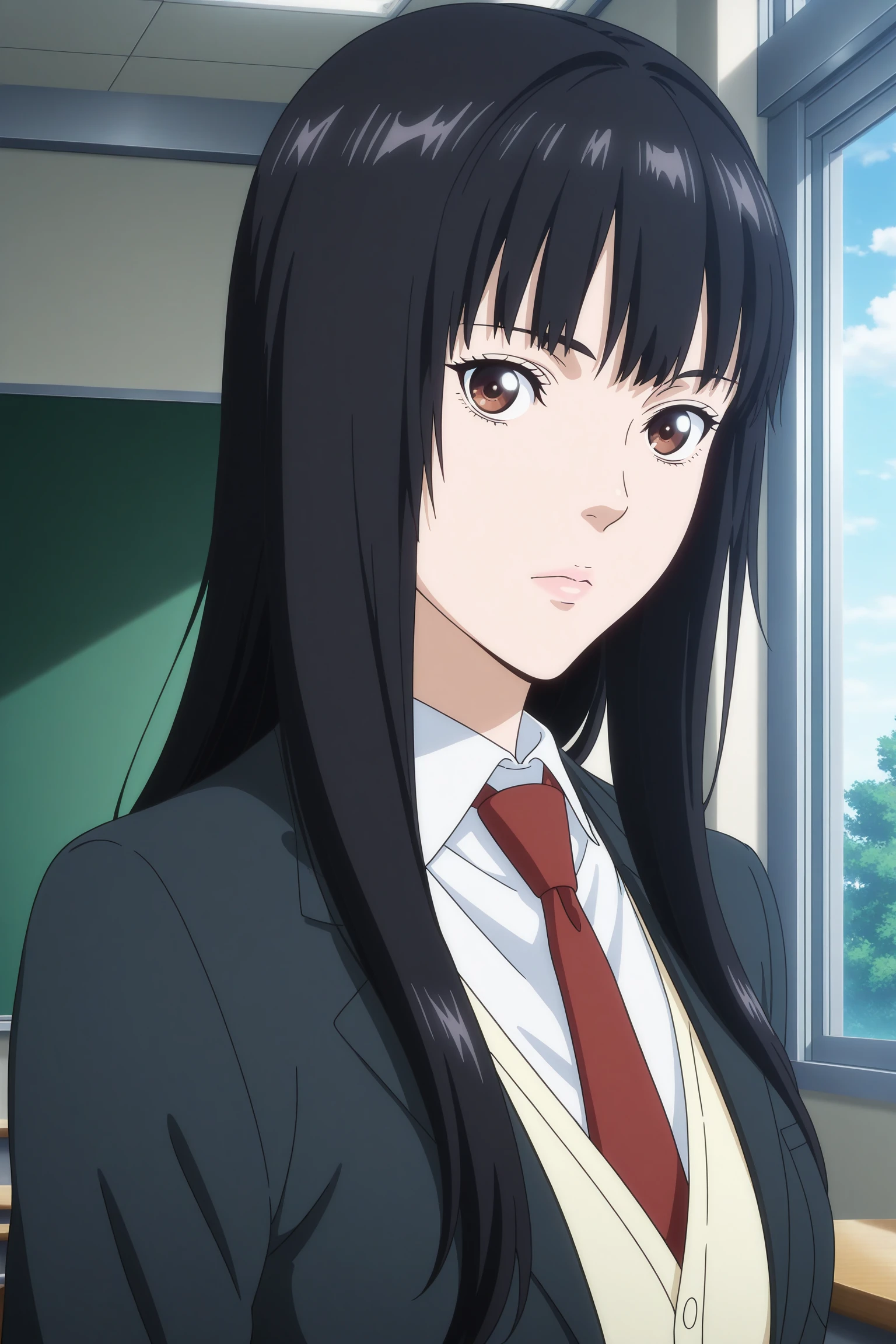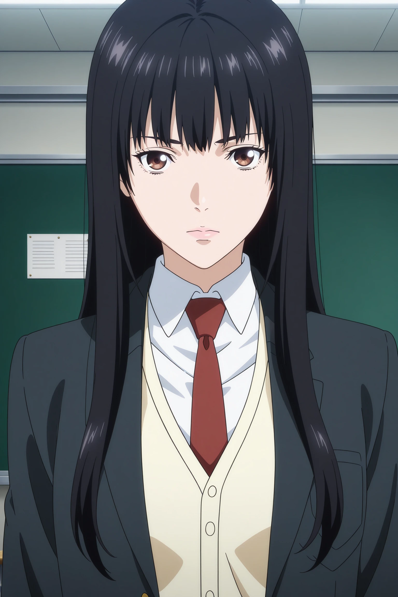 inuyashiki mari, long hair, black hair, brown eyes, school uniform, blazer, black jacket, white shirt, collared shirt, red necktie, yellow cardigan, black skirt, pleated skirt, white kneehighs, loafers