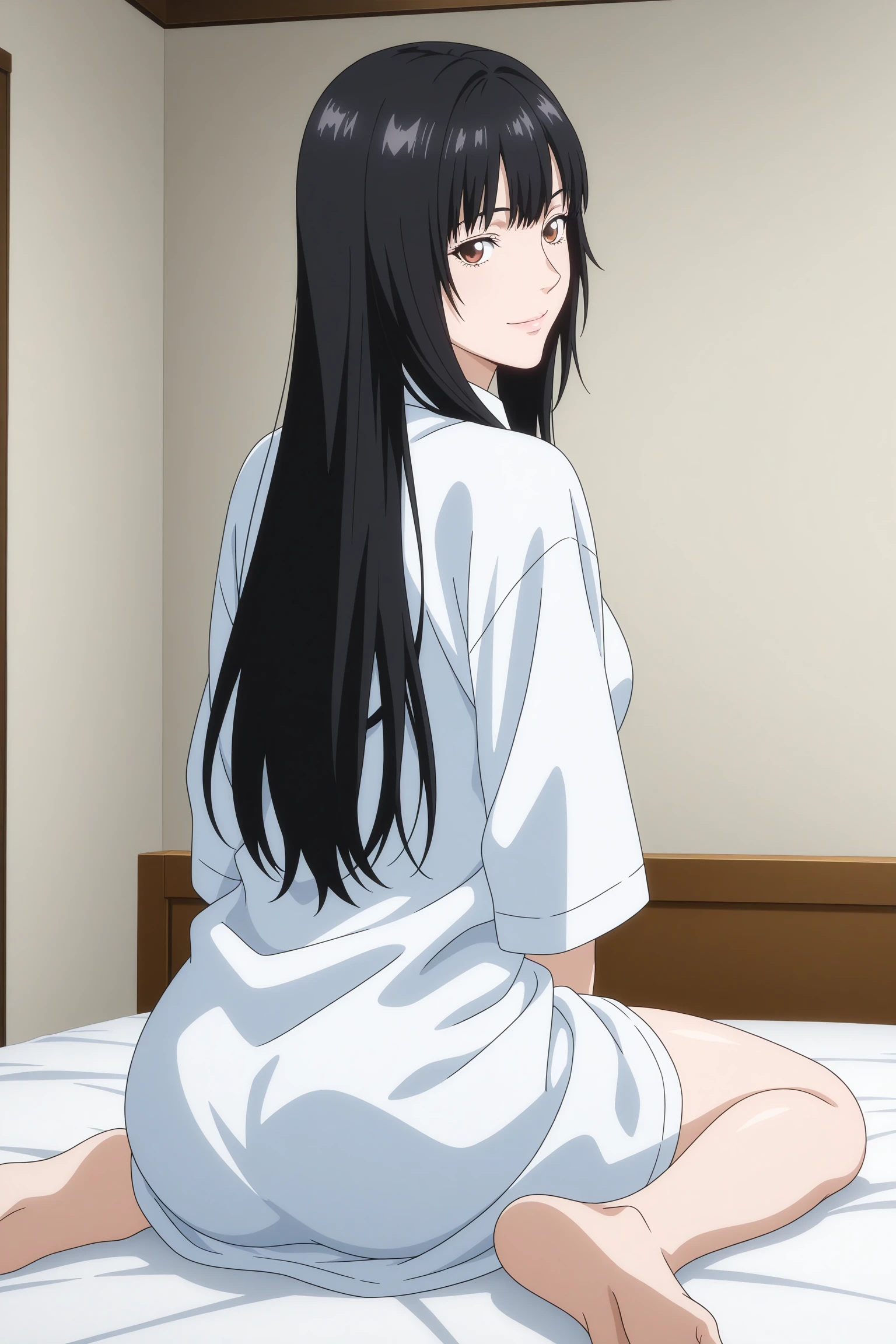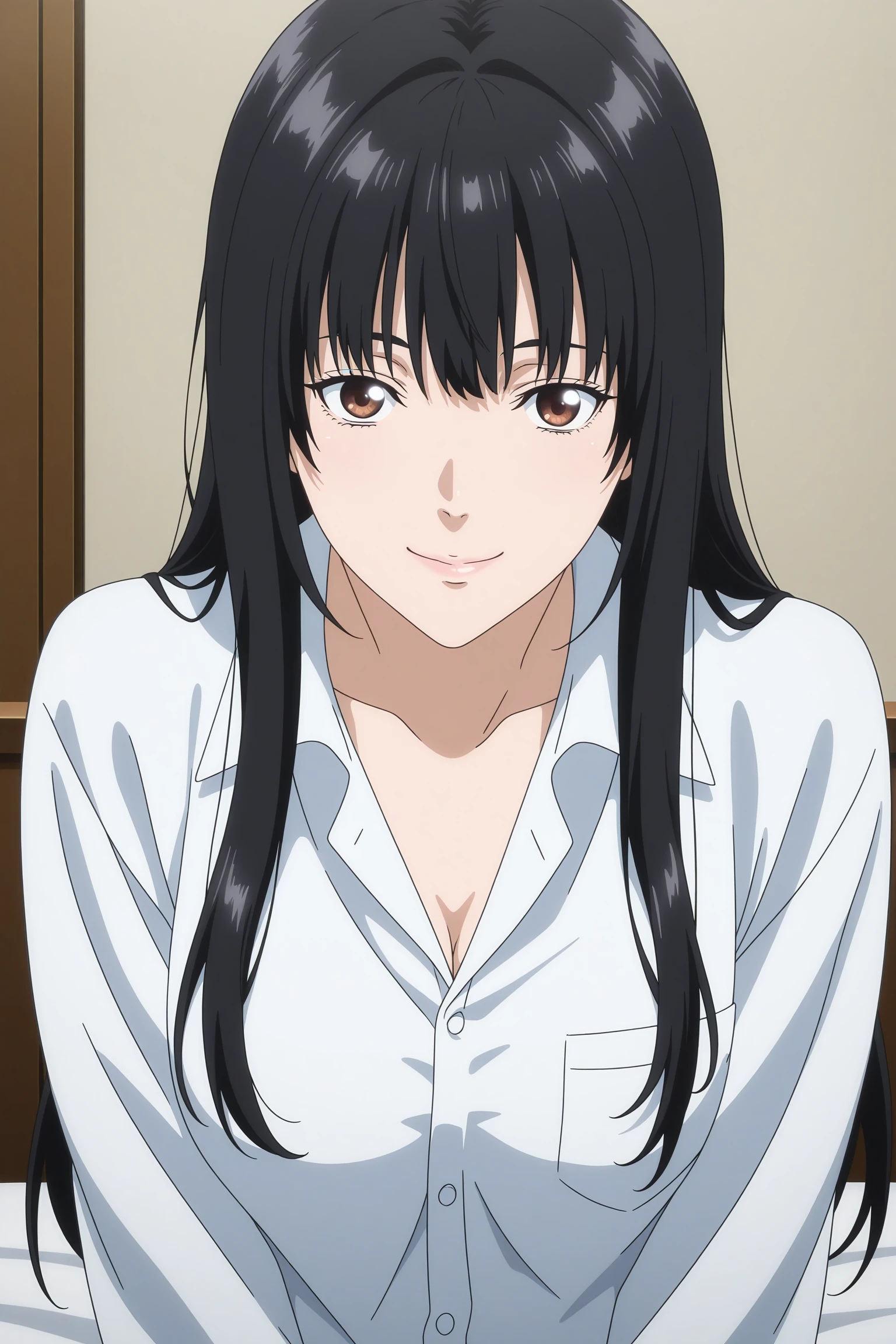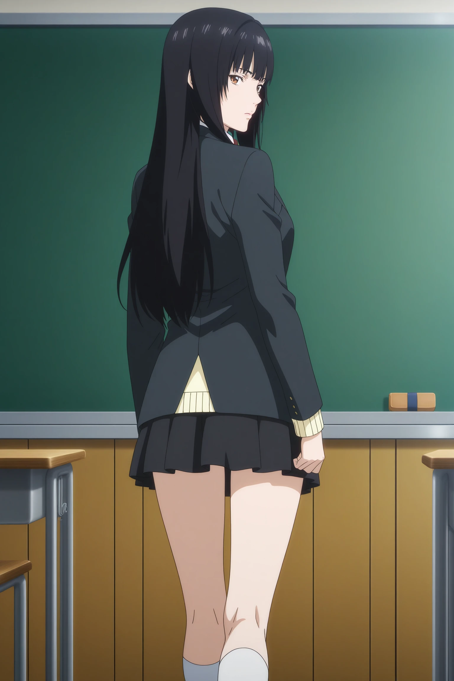 inuyashiki mari, long hair, black hair, brown eyes, school uniform, blazer, black jacket, white shirt, collared shirt, red necktie, yellow cardigan, black skirt, pleated skirt, white kneehighs, loafers