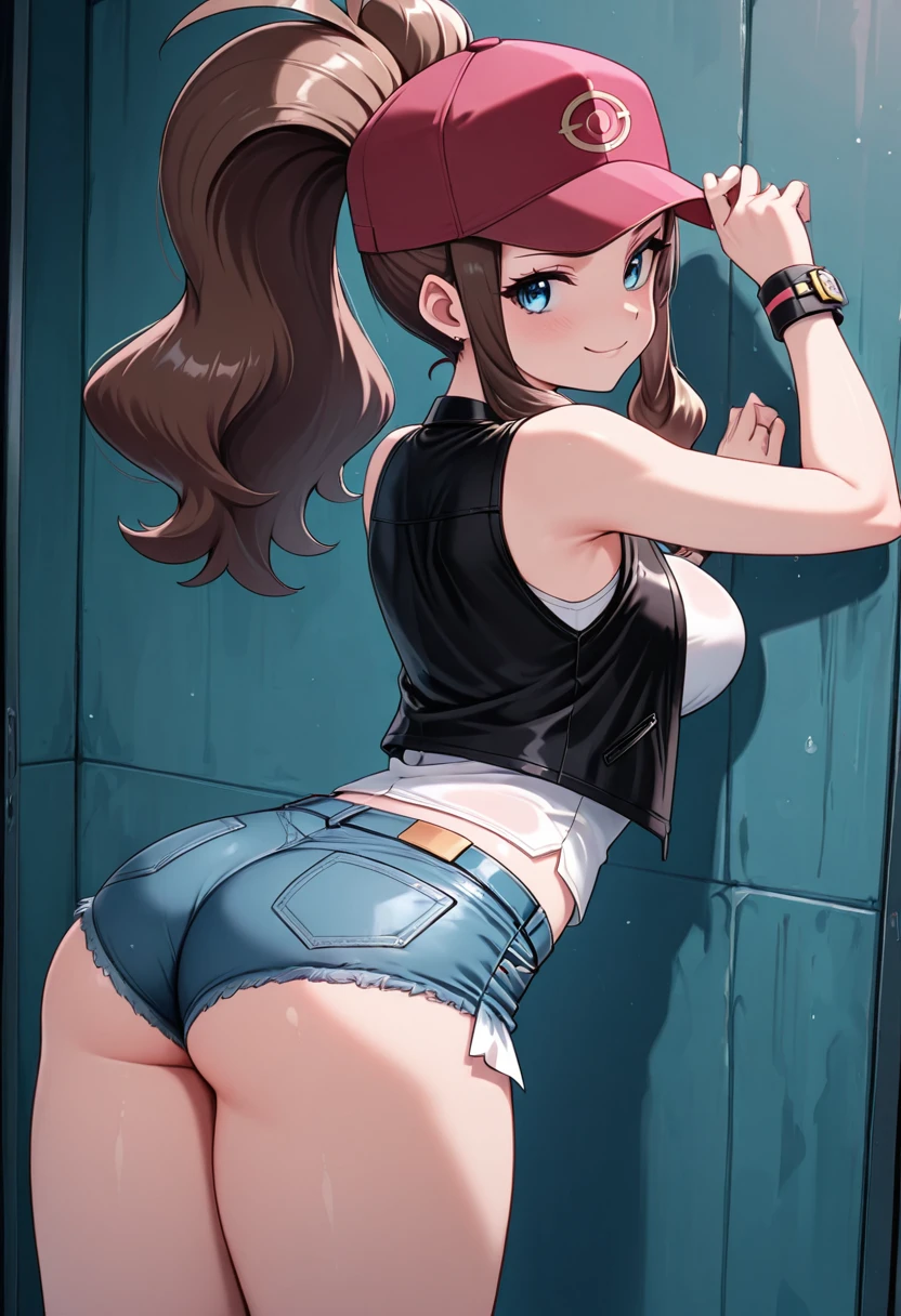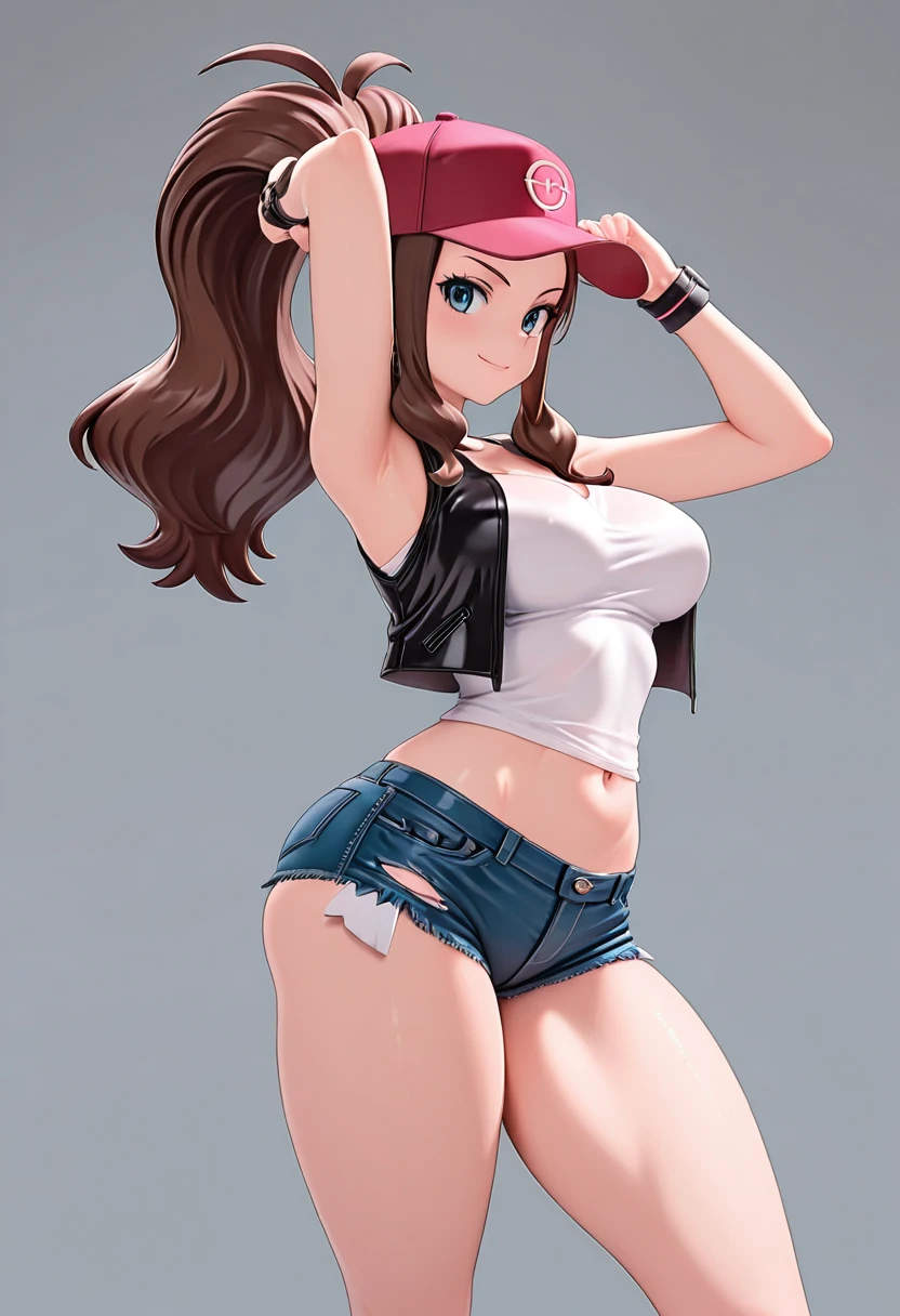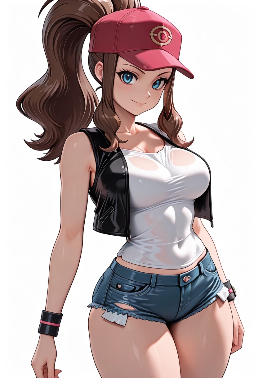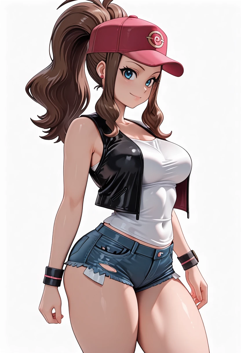 zzHilda, blue eyes, brown hair, long hair, high ponytail, sidelocks, red hat, white shirt, black vest, sleeveless, wristband, short shorts, cutoffs, denim shorts, exposed pocket, , wide hips,