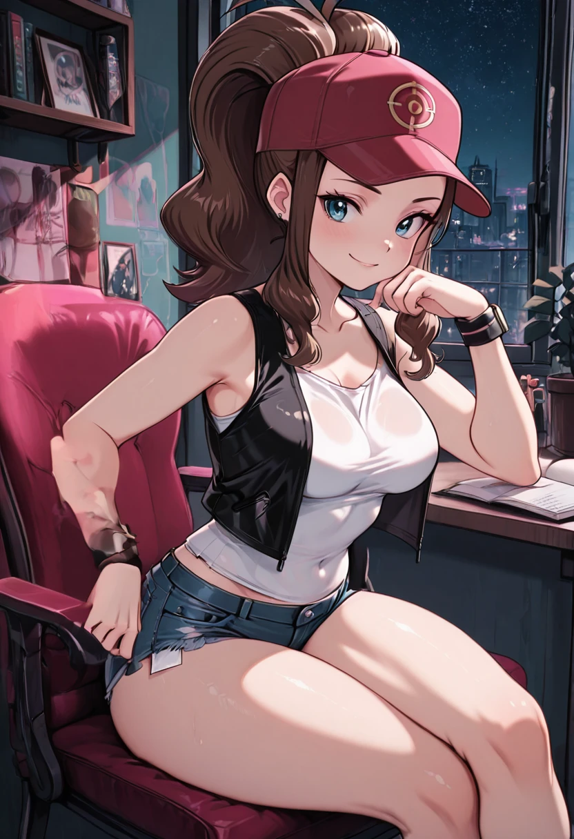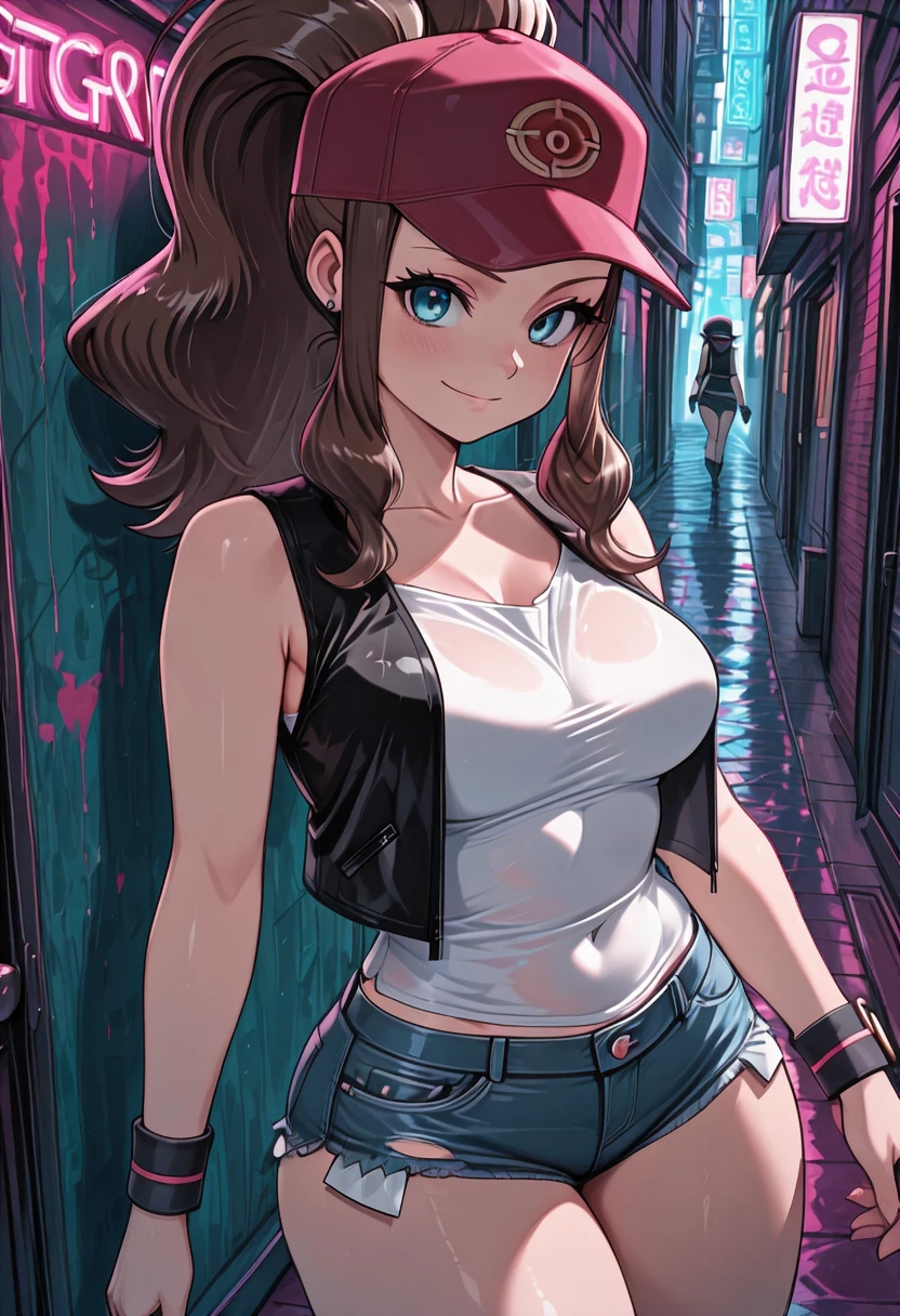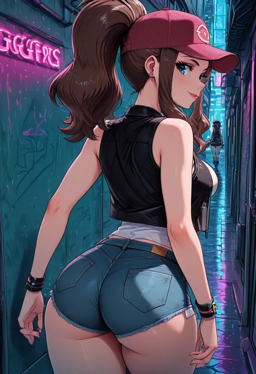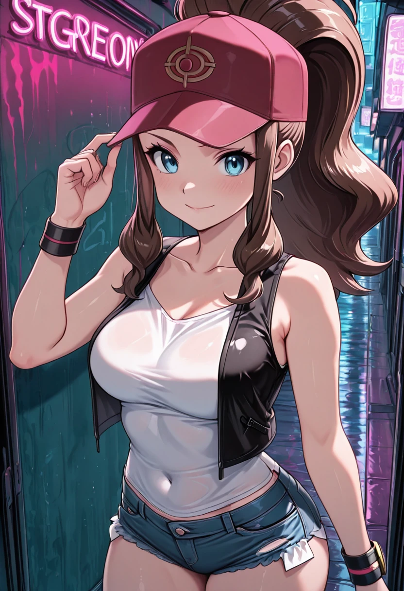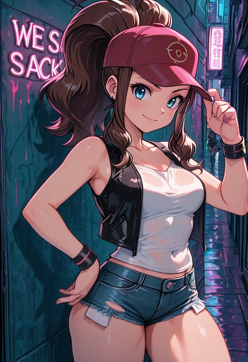 zzHilda, blue eyes, brown hair, long hair, high ponytail, sidelocks, red hat, white shirt, black vest, sleeveless, wristband, short shorts, cutoffs, denim shorts, exposed pocket, , wide hips,