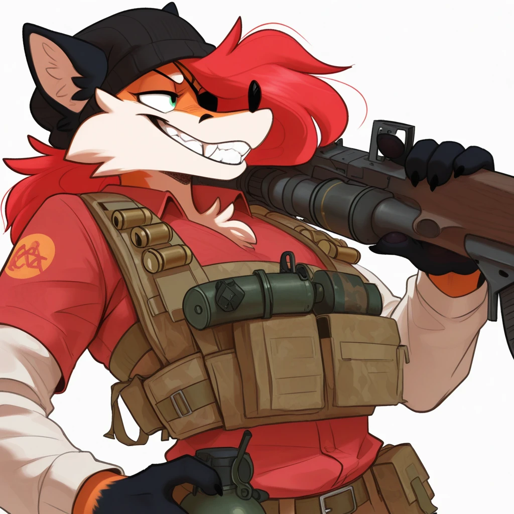 p3pp3r_f0mx, flat colors, black outline, anthro, fox, female, solo, two tone body, animal ears, black nose, red hair, swept bangs, wavy hair, hair, long hair, messy hair, green eyes, eyelashes, big breasts, cute fangs, cheek tuft, looking at viewer, small waist, fluffy tail, 5 fingers,