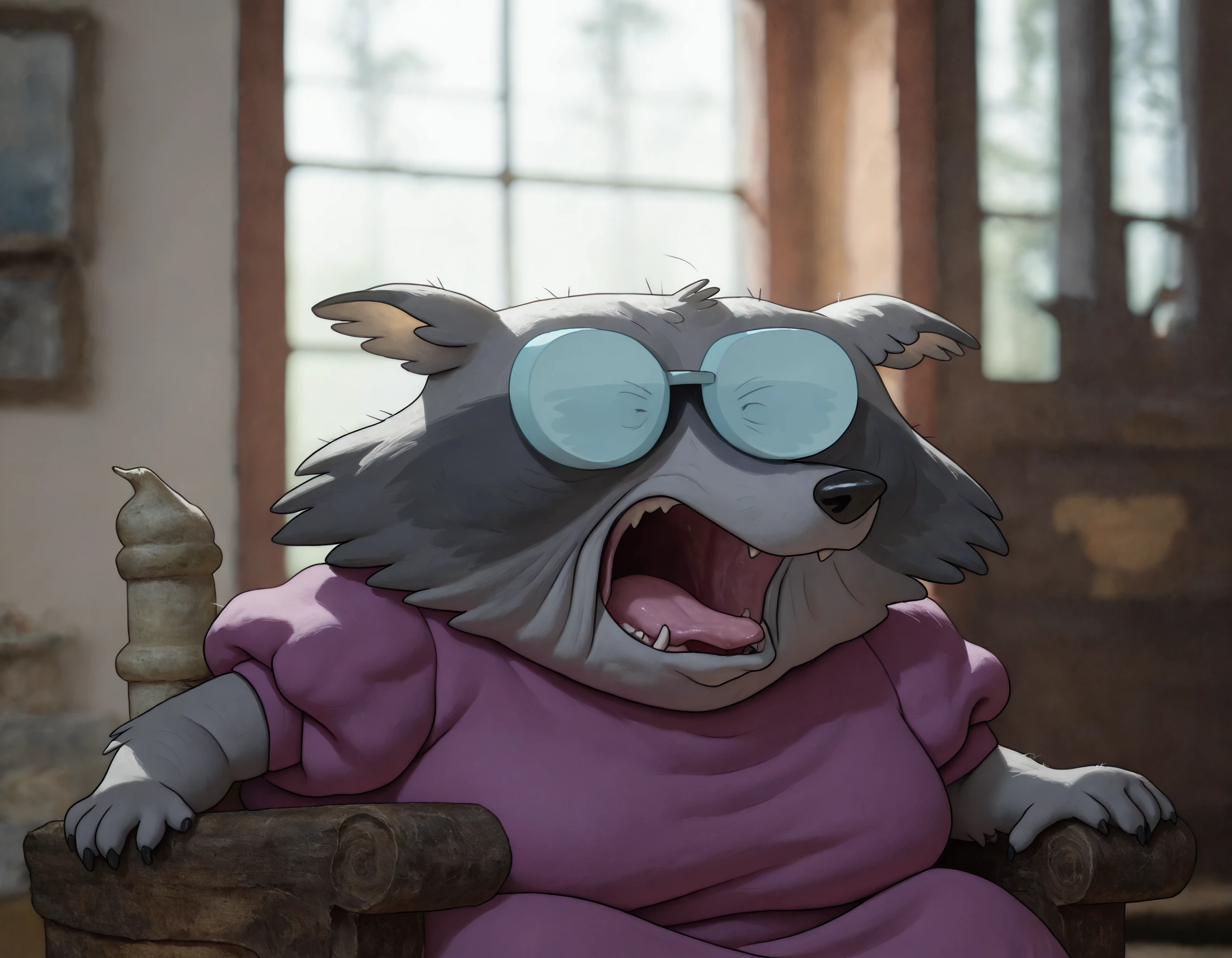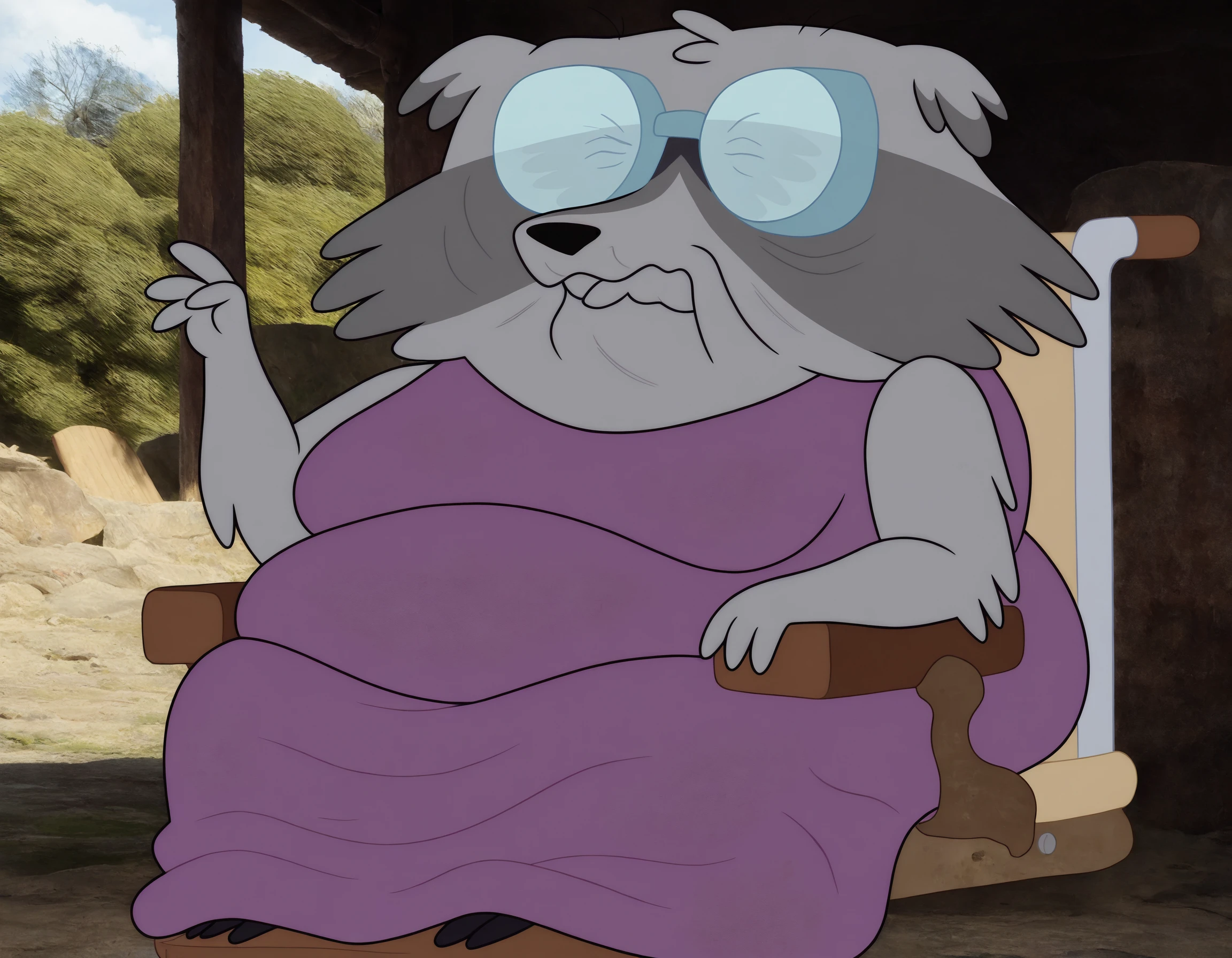 elderly,female,raccoon,purple dress,glasses,gray fur skin