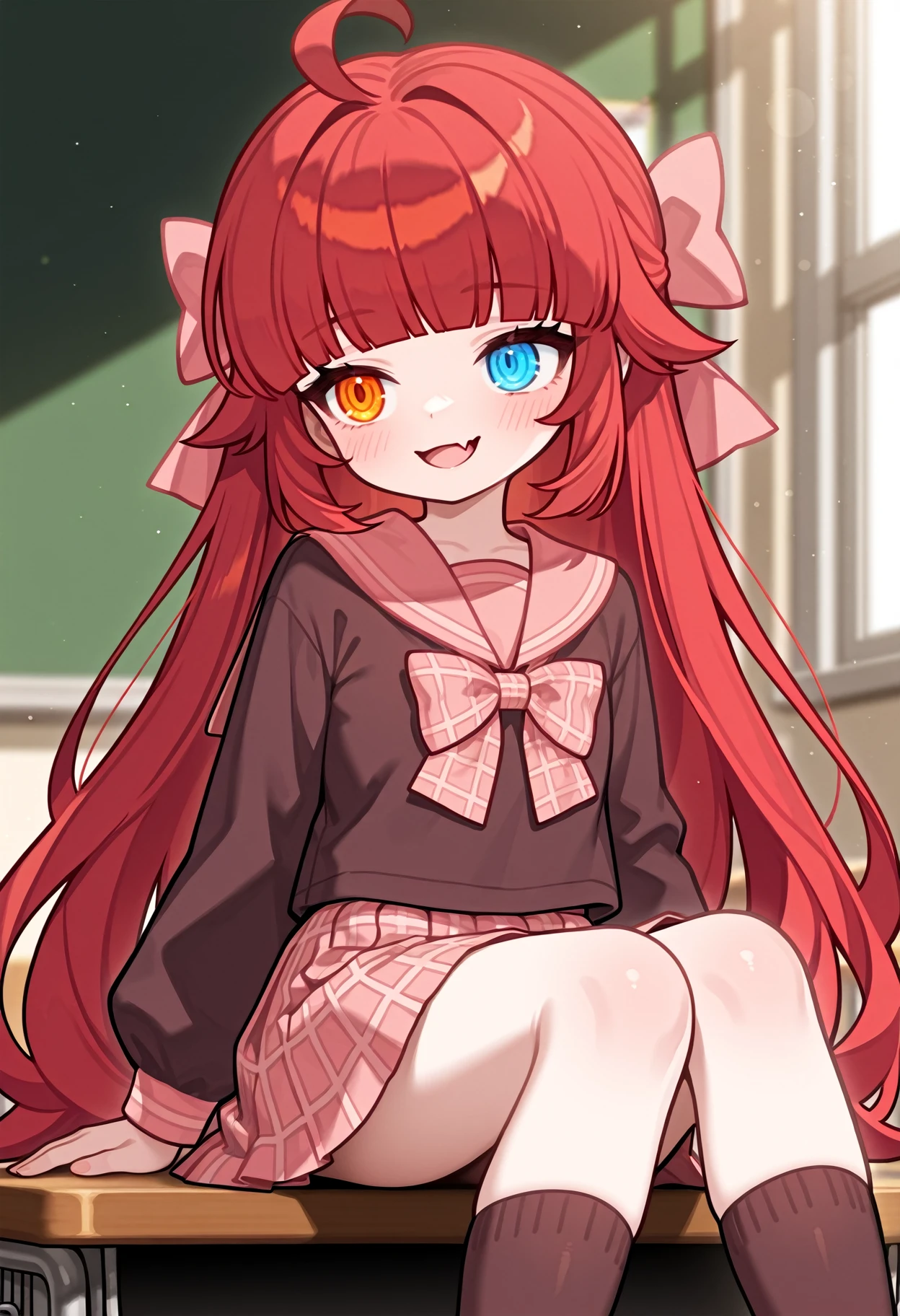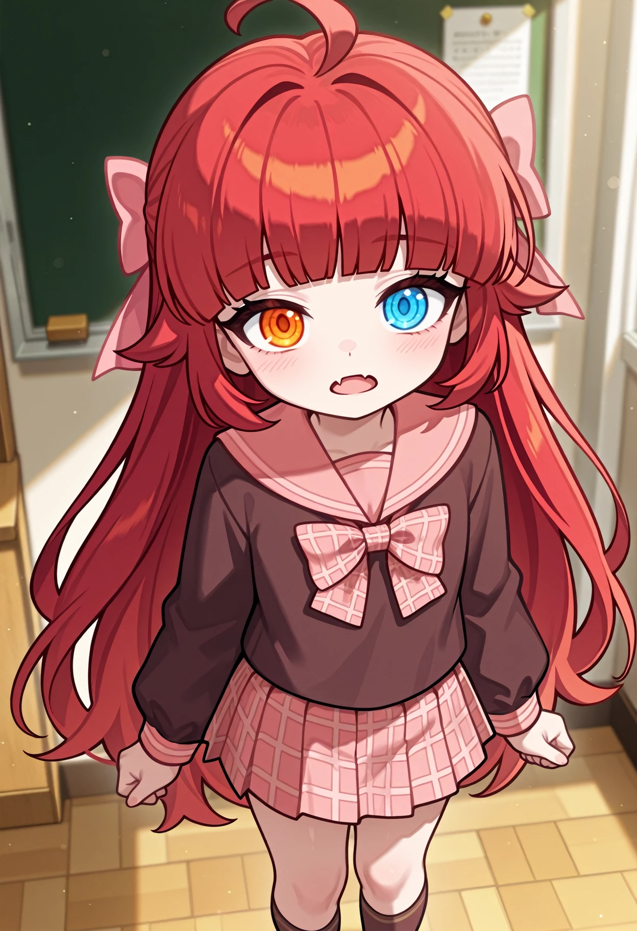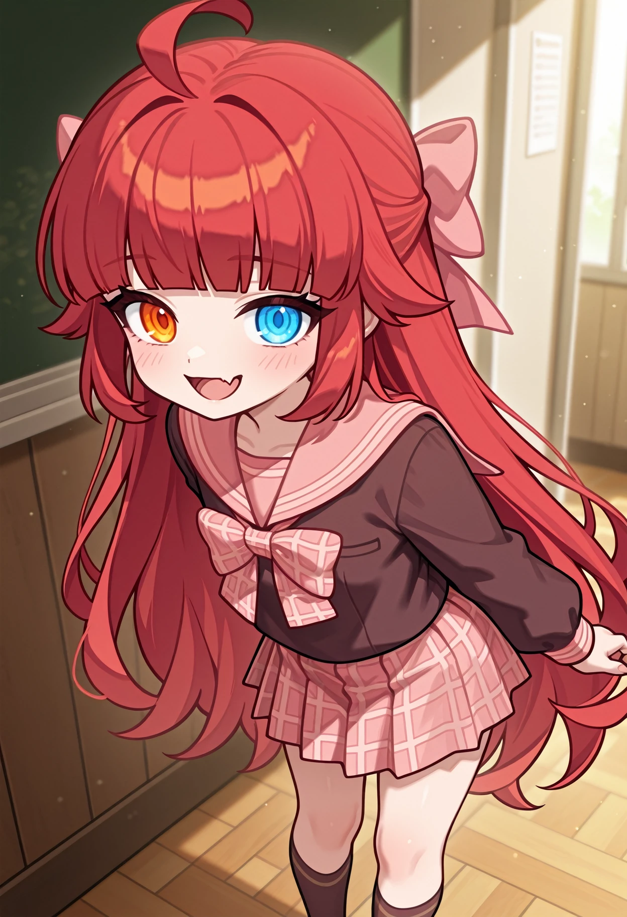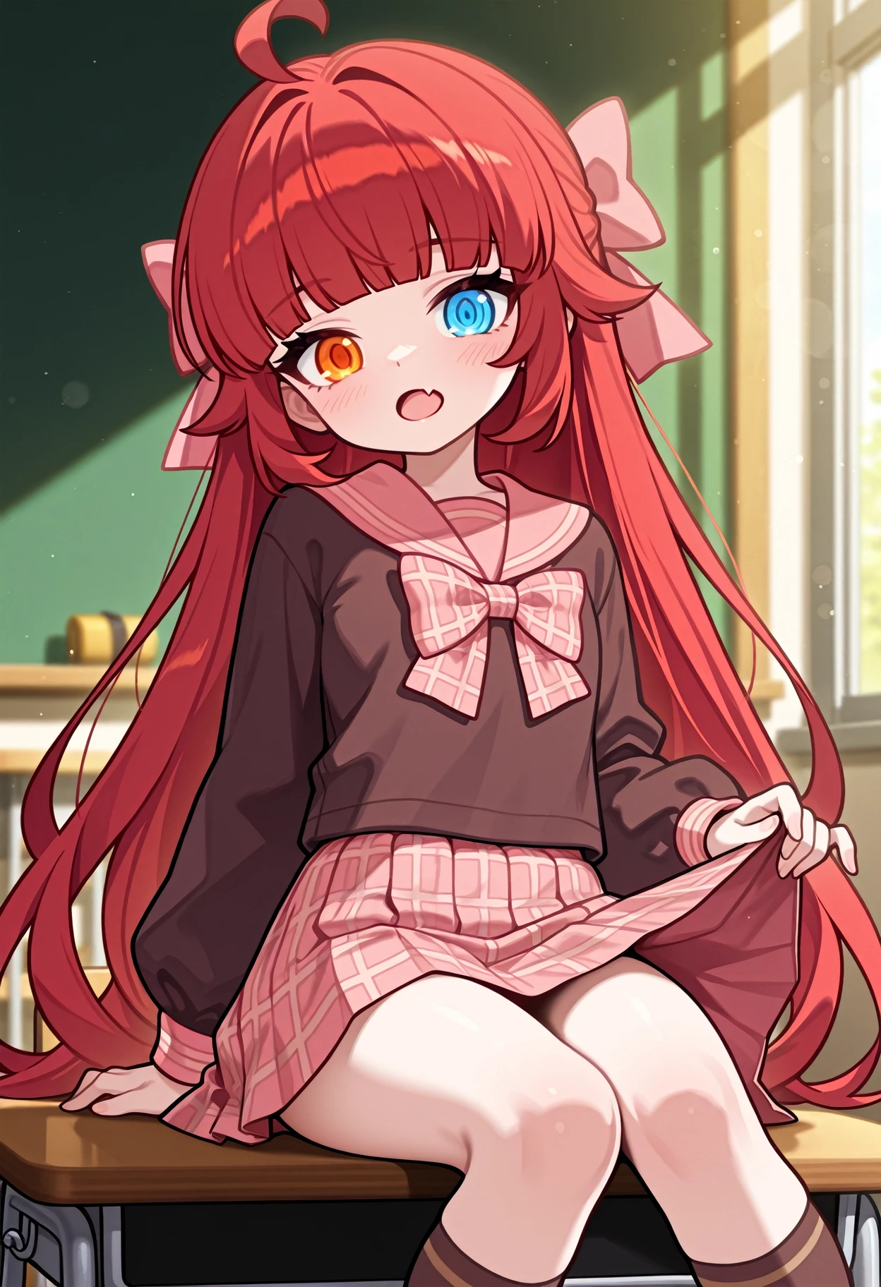 1girl, solo, shirt, bow, hair bow,pink bow, plaid bow, school uniform, serafuku, sailor collar,brown shirt, plaid, red hair, long hair,blunt bangs, ue eyes,blue eyes, orange eyes, heterochromia, ahoge, long sleeves, brown sailor collar, pink sailor collar, skirt, plaid skirt,pleated skirt, pink skirt, brown socks