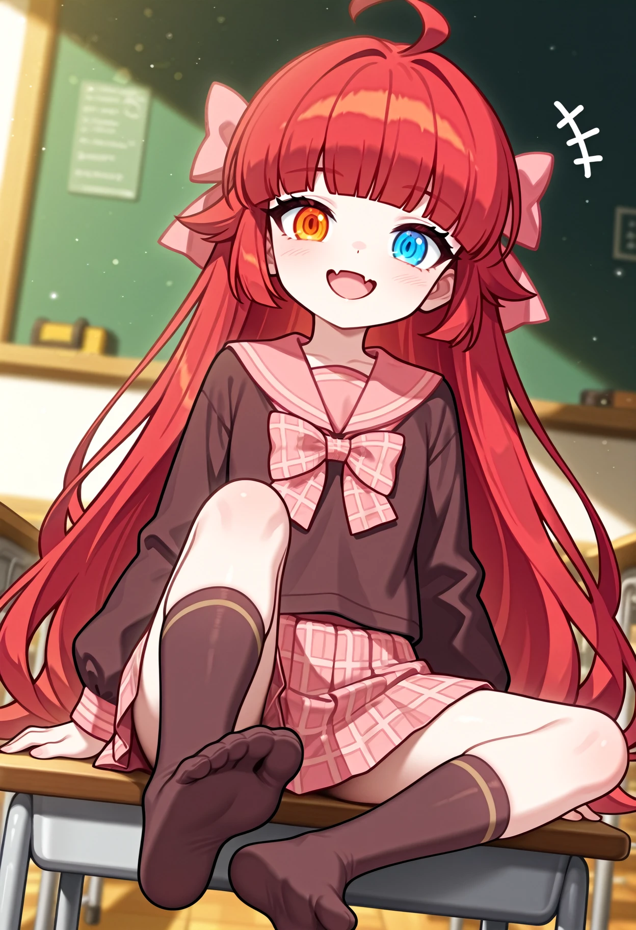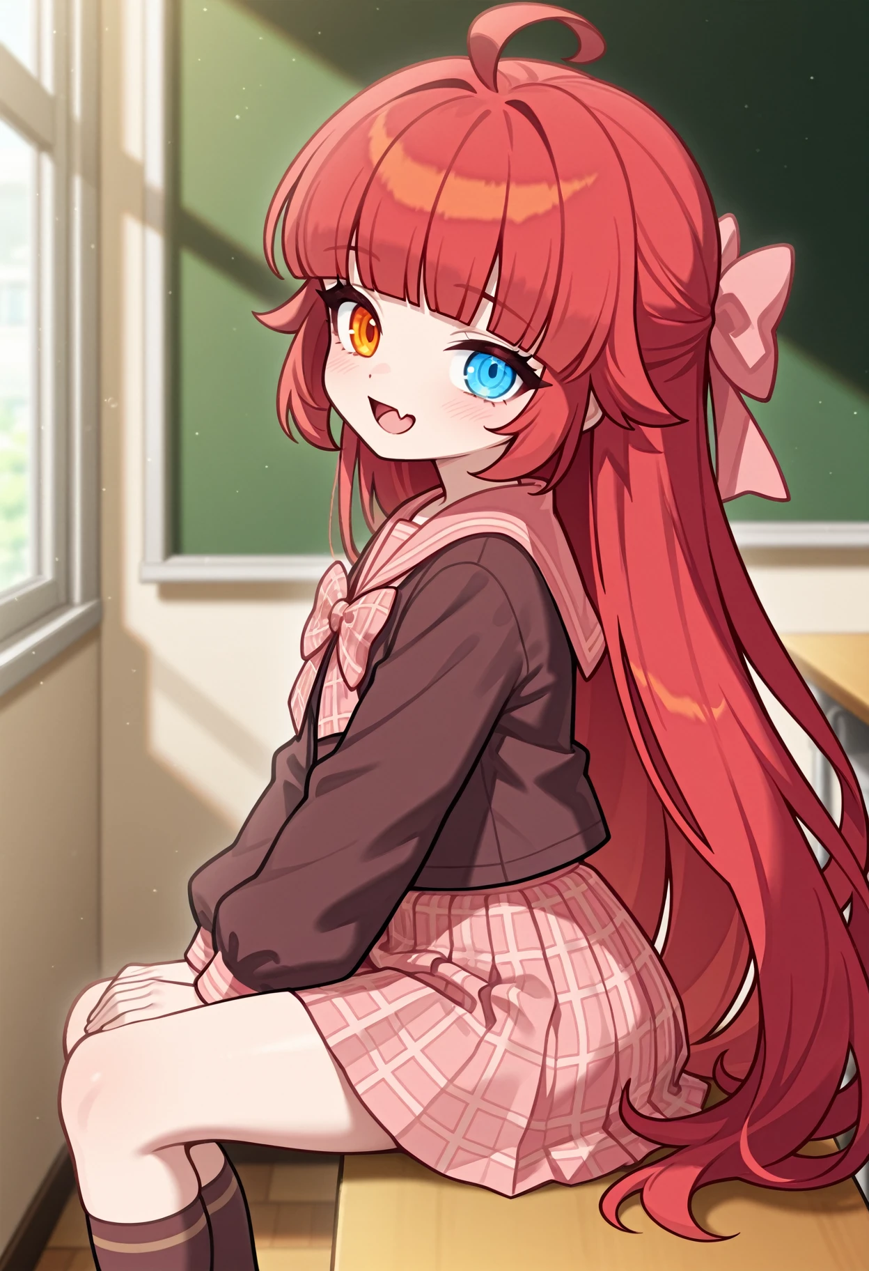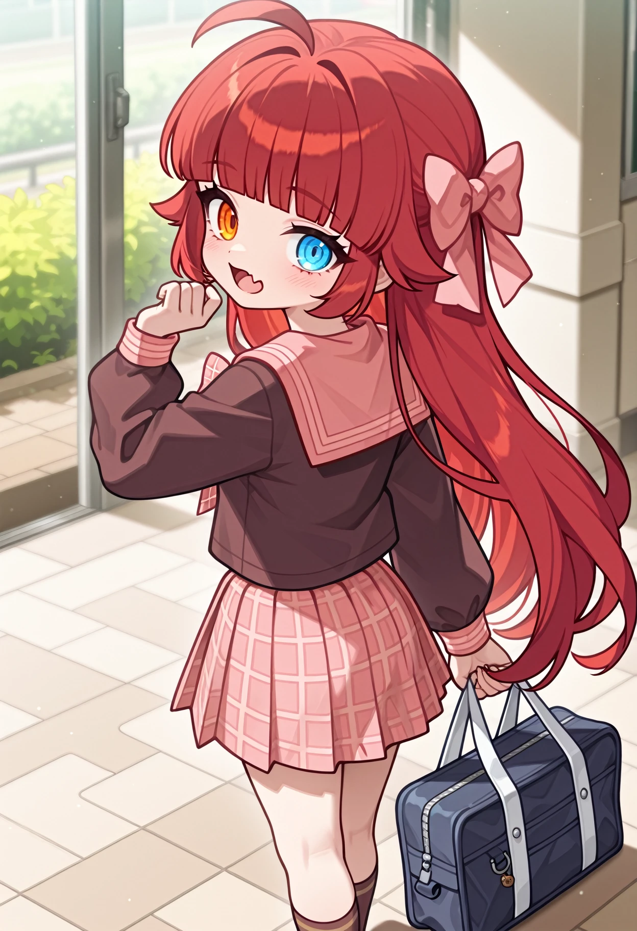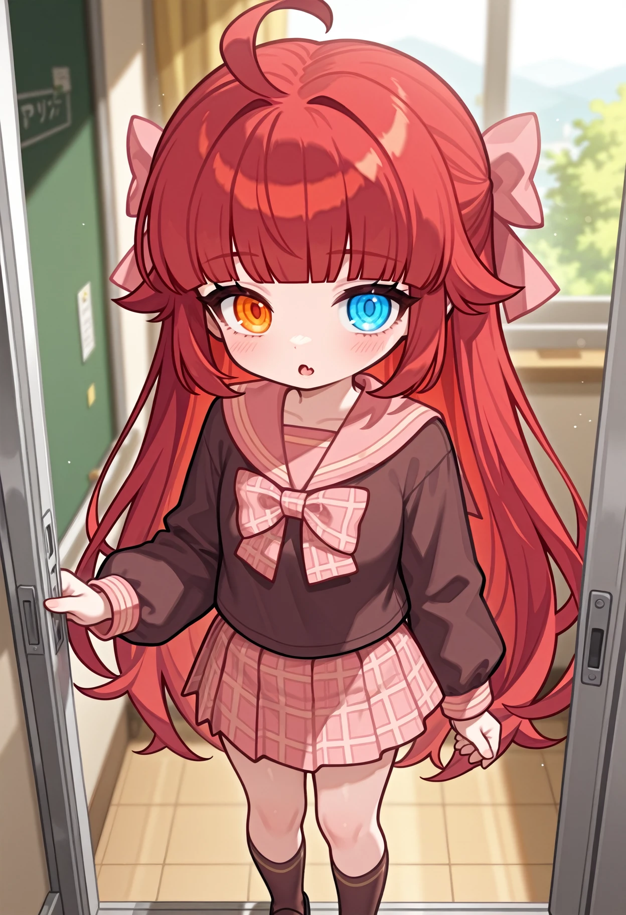 1girl, solo, shirt, bow, hair bow,pink bow, plaid bow, school uniform, serafuku, sailor collar,brown shirt, plaid, red hair, long hair,blunt bangs, ue eyes,blue eyes, orange eyes, heterochromia, ahoge, long sleeves, brown sailor collar, pink sailor collar, skirt, plaid skirt,pleated skirt, pink skirt, brown socks