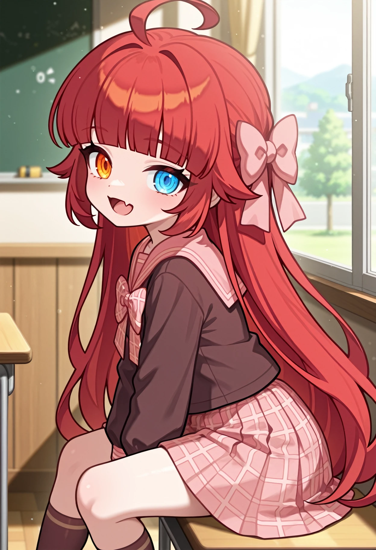 Prompt : 1girl, solo, shirt, bow, hair bow,pink bow, plaid bow, school uniform, serafuku, sailor collar,brown shirt, plaid, red hair, long hair,blunt bangs, ue eyes,blue eyes, orange eyes, heterochromia, ahoge, long sleeves, brown sailor collar, pink sailor collar, skirt, plaid skirt,pleated skirt, pink skirt, brown socks
