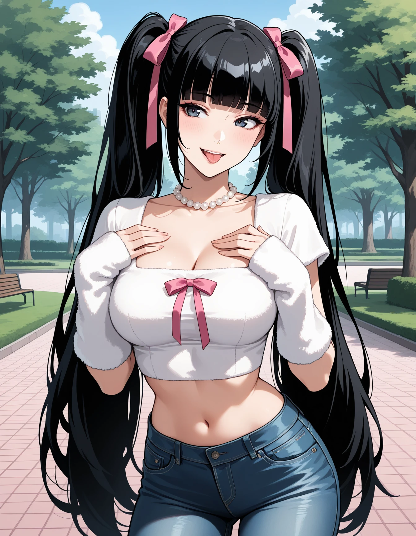 long twintails, black hair, blunt bangs, pink ribbon, long hair ribbons, jeans, pearl necklace, chest bow, angora crop top, fuzzy cashmere, hand warmers, fingerless gloves