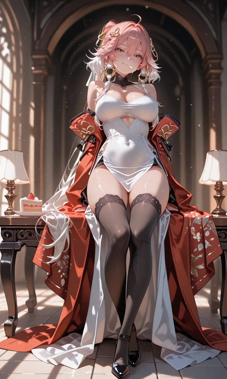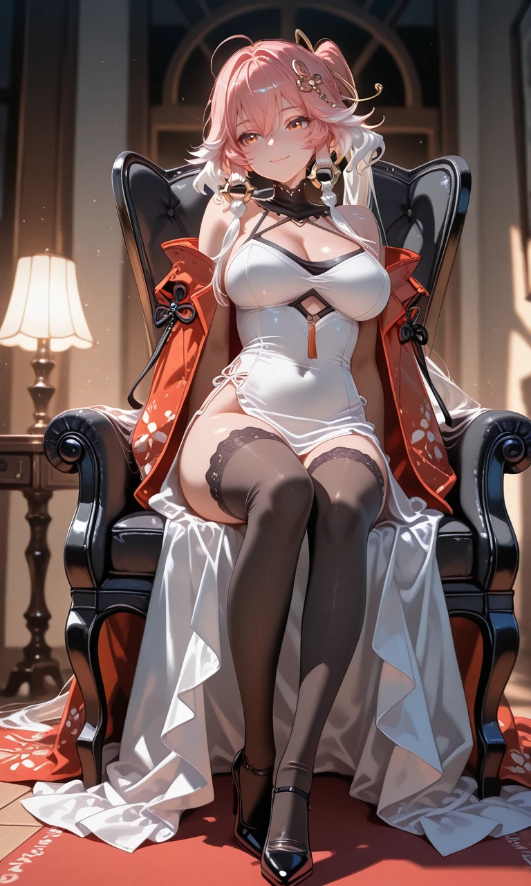 1girl, long hair, gradient hair, pink hair, white hair, amber eyes, hair ornament, side ponytail, fox theme, elegant, confident expression, white dress, high slit dress, thigh-highs, black stockings, black heels, red cloak, patterned cloak, gold accents, ornamental tassels, spear, weapon, gloves, red sleeve, fantasy outfit, wuthering waves, changli