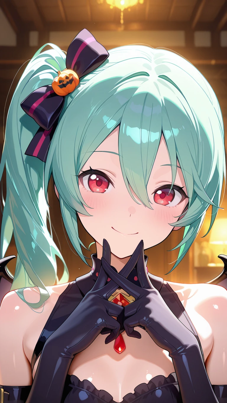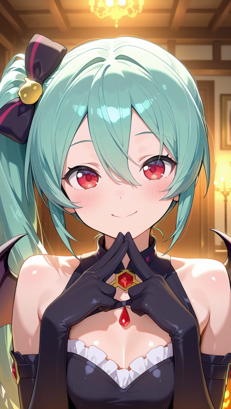 long hair,green hair,side ponytail,hair bow,hair between eyes,red eyes